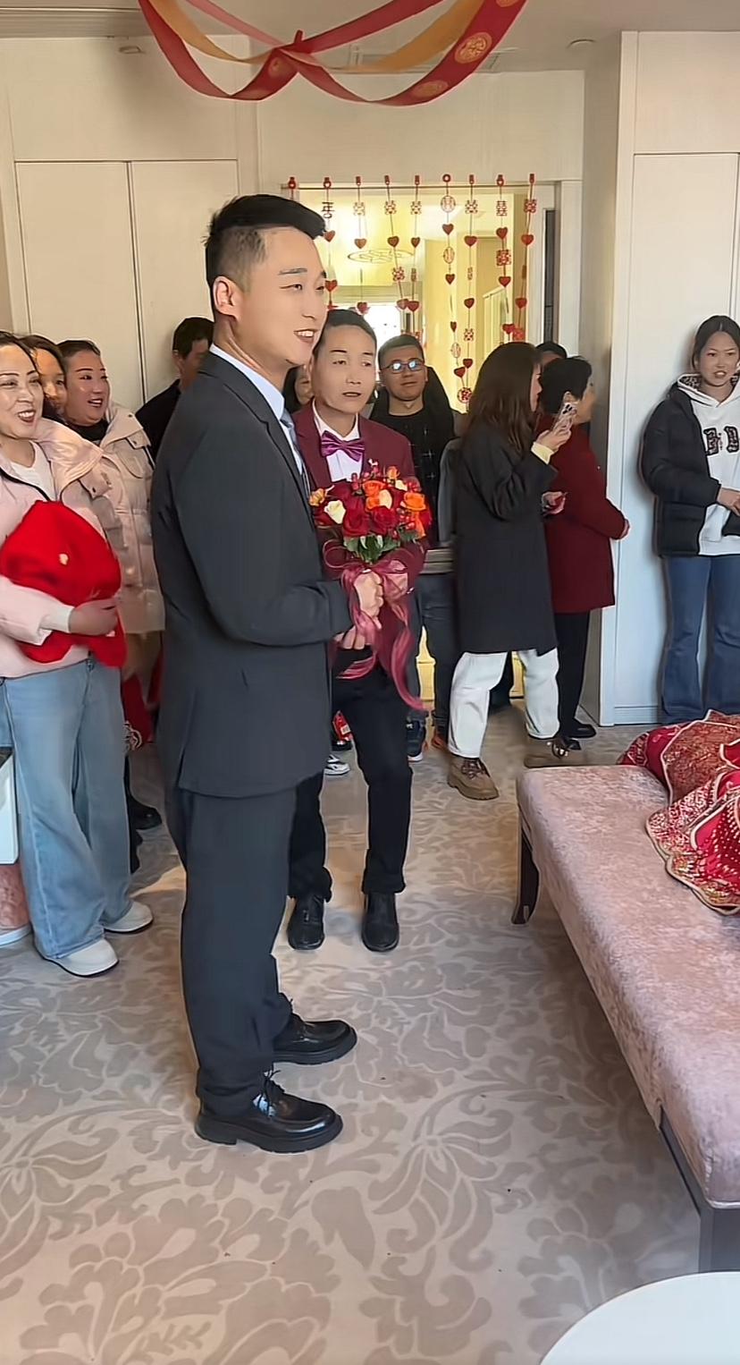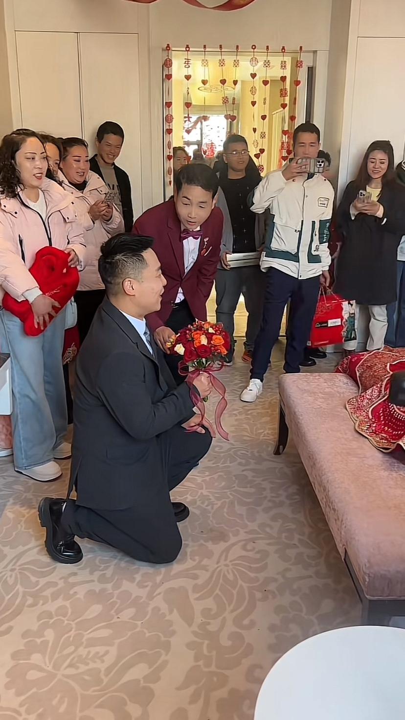 大姐够多大了?感觉不年轻了,床下站的帅小伙真年轻,一群人围着祝福,那是真爱啊,都下跪了!