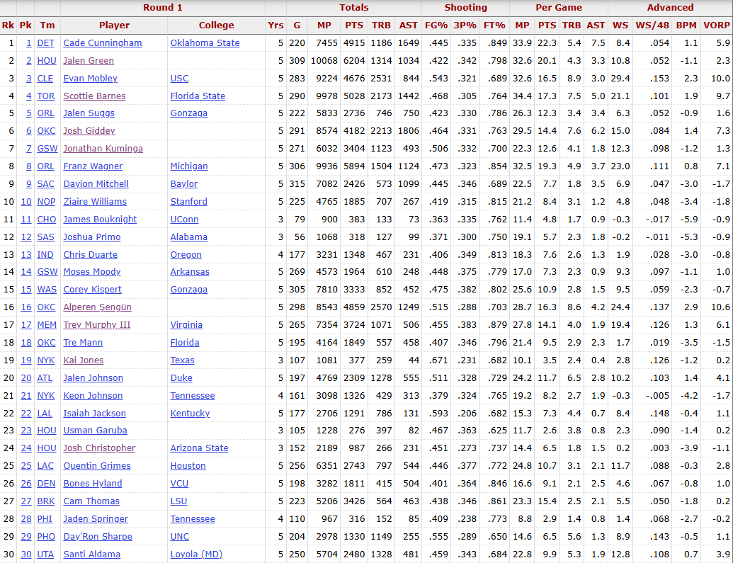 2021年选秀可以说是近年当中的选秀大年,其中的坎宁安、莫布利、巴恩斯与申京都已经入选过全明星,坎宁安与莫布利均在上赛季入选了最佳阵容,坎宁安在本赛季更是率领活塞打出了13胜2负的骄人战绩。