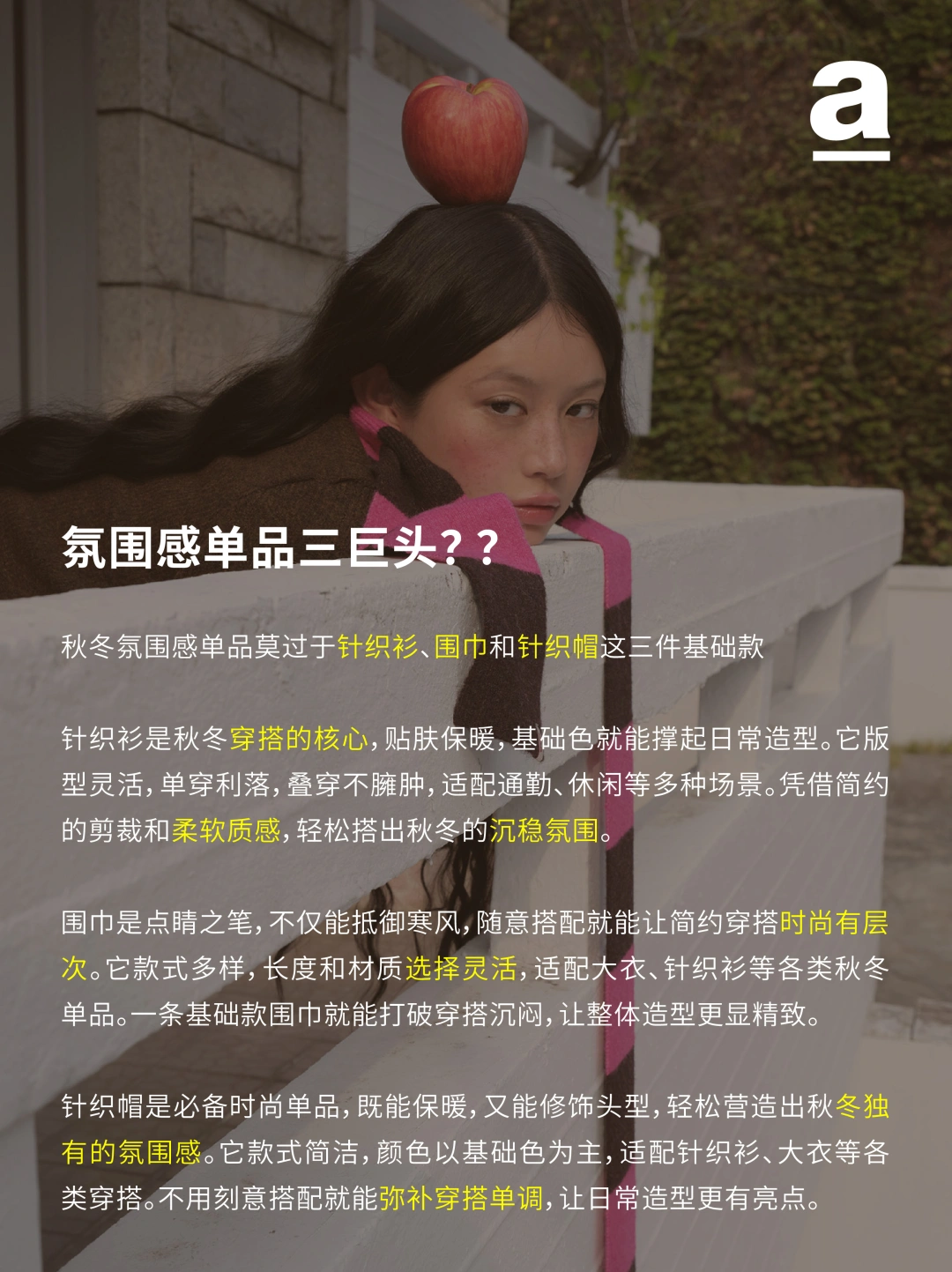 当街头的风染上凉意,衣柜里的棉针织单品就该登场了。秋冬氛围感三巨头莫过于针织衫、围巾、针织帽,他们是换季穿搭里当之无愧的“百搭王”,赶紧把这些核心单品和面料知识点码好! 先聊聊秋冬棉针织面料的“过人之处”。作为贴近肌肤的优选材质,棉针织以天然棉纤维为基底,通过针织工艺形成疏松透气的结构,触感软糯扎实却不压身。秋冬款的棉针织通常会采用更粗的纱线或加密编织,保暖性媲美薄羊毛,却没有羊毛的扎肤感,敏感肌也能放心贴身穿。更值得一提的是它的“氛围感基因”——面料自带的自然纹理(如罗纹、坑条、绞花),无需多余装饰就有层次;洗后会呈现轻微的软糯垂坠感,穿在身上自带松弛感,比硬挺面料更显亲和。 选对棉针织单品,氛围感直接拉满。在打理方面也无需费心,棉针织单品耐穿易洗,手洗或机洗选轻柔模式,平铺晾干就能避免变形,穿整个秋冬都能保持蓬松软糯的质感。 它们未必是华丽的爆款,却能以细腻的质感,让整体造型更有温度与格调,轻松拿捏秋冬独有的沉静与浪漫~