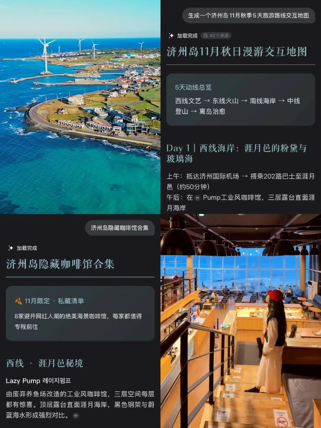 又到了济州岛的淡季 秋天的济州岛简直人间理想 现在来几乎每天都天气好、海水蓝,还人少! 还有秋冬限定的芒草、粉黛、汉拿山枫叶 真的随手拍都好出片~ - 📷拍照机位 📍涯月邑 P1/5/11 📍鸡旨海岸道路(닭머르해안도로)P6/14 📍月汀里 P2/7/10 📍晨星岳芒草 P15 📍Seabil Cafe 粉黛乱子草 P13 📍汉拿山御里牧枫叶 P17 📍城山日出峰栈道免费段 P16 📍西归浦松岳山海湾夜景 P18 - 这次能挖掘到这么多宝藏景点,顺利拍出这么多美照,还多亏了我新发现的一个宝藏应用『灵光App』。用它真的能帮忙解决旅行中碰到的很多问题,真是简单又高效。 📷打卡景点路线规划 像我这次已经是第二次来济州岛了,上次是春天的樱花季,这次秋天来除了经典的海边景点,还想看点不一样的济州岛秋天风景,但又实在懒得自己各种搜集资料做攻略。 尝试用『灵光App』生成攻略,一下子就给我找到了好几个济州岛秋天特色的芒草和粉黛乱子草的景点,不仅帮我快速了解景点信息,还给我规划好交通路线、拍照技巧,找隐藏咖啡店等,真的省时省力,本P人有被解救到 💰出国汇率换算开销记账 出国旅游经常需要汇率换算,和朋友一起消费还要单独记账,数学不好真的很混乱,于是让灵光帮我生成了一个结合汇率换算和AA分账的小程序,真的很实用~ 它直接给换算好汇率、每一笔开销都能记得很清楚,跟朋友 A 账单都省的算了。这是以往用其它 AI 产品都没体验过的功能👍🏻 📖 外语即时翻译 还有旅行中经常遇到看不懂的韩文,我都立马打开『灵光App』的开眼功能,摄像头直接就能识别拍到的画面,便利店买东西、餐厅点餐吃饭的菜单再也不用担心看不懂了,在国外用真的很方便,建议大家都可以下一个来试试~