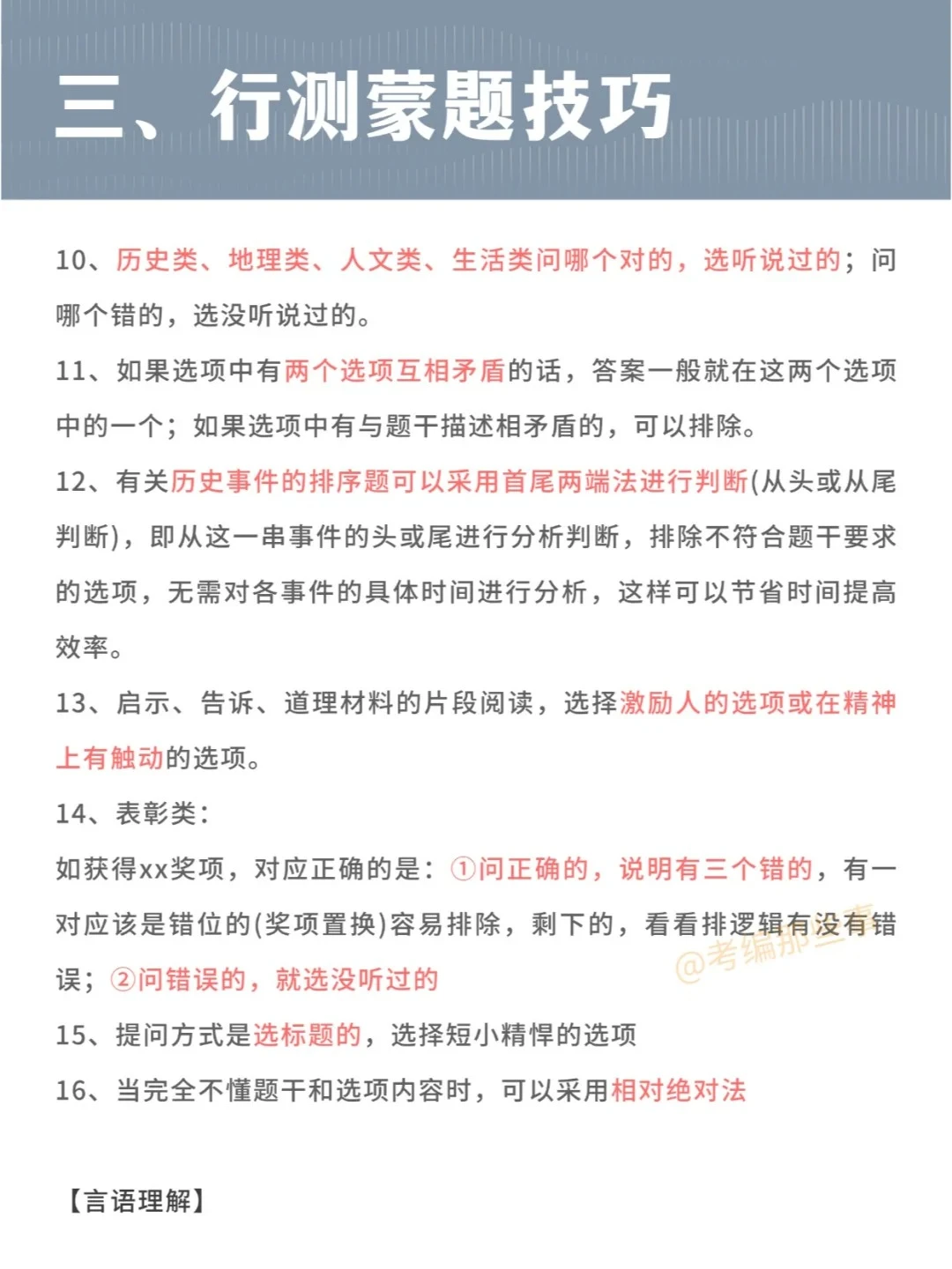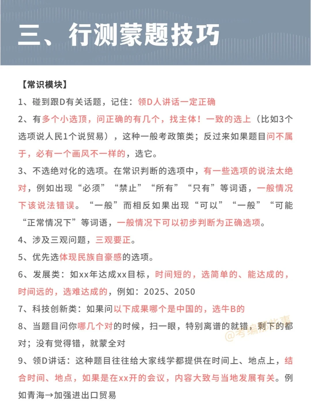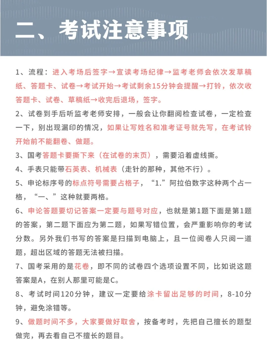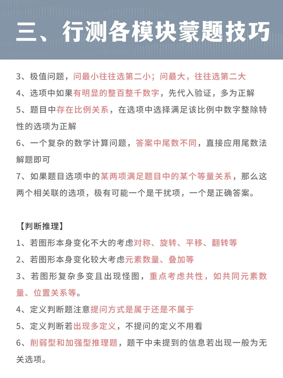 💛💛物品清单: 身份证、准考证、黑色签字笔、涂卡笔/2B铅笔、橡皮、透明笔袋、机械手表等 . 💛💛考试流程: 进入考场后签字→宣读考场纪律→监考老师会依次发草稿纸、答题卡、试卷→考试开始→考试剩余15分钟会提醒→打铃,依次收答题卡、试卷、草稿纸→收完后退场,签字。 (记得留出涂卡时间) . 💛💛蒙题技巧 1、常识 ◼ 碰到跟 * 有关话题,记住... ◼ 有多个小选顶,问正确的有几个,找主体!一致的选上(比如3个选项说人民1个说贸易),这种一般考政策类;反过来如果题目问不属于,必有一个画风不一样的,选它。 ...... 2、言语理解 ◼ 先读问题,再读题干,带着问题找答案。 ◼ 重点看逻辑关系;相信固定搭配;排除极端选项 ◼ 提问方式是选标题的,选择短小精悍的选项。 ...... 3、数量关系 ◼ 分析选项整体性,三奇一偶选其偶,三偶一奇选其奇 ◼ 选项有升降,蕞大蕞小不必看,答案多为中间项 ◼ 极值问题,问蕞小往往选第二小;问蕞大,往往选第二大 ...... 4、判断推理 ◼ 若图形本身变化不大的考虑对称、旋转、平移、翻转等 ◼ 若图形本身变化较大考虑元素数量、叠加等 ◼ 削弱型和加强型推理题,题干中未提到的信息若出现一般为无关选项。 ...... 5、资料分析 ◼ 先看问题,阅读时勾画关键词。 ◼ 题干有“约”字的选项一定不是整数。 ......