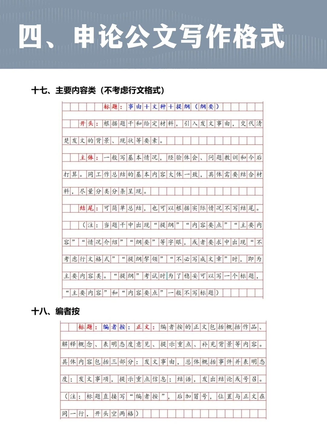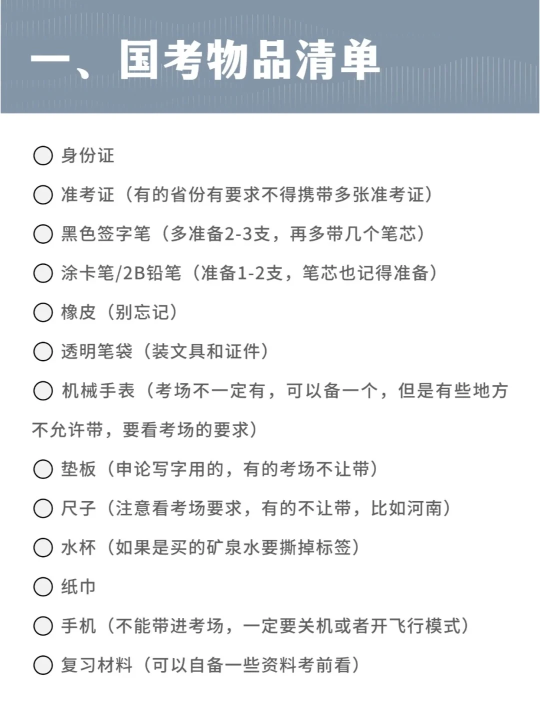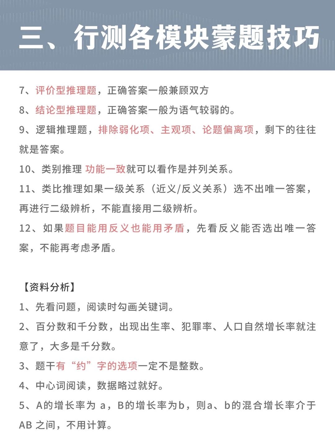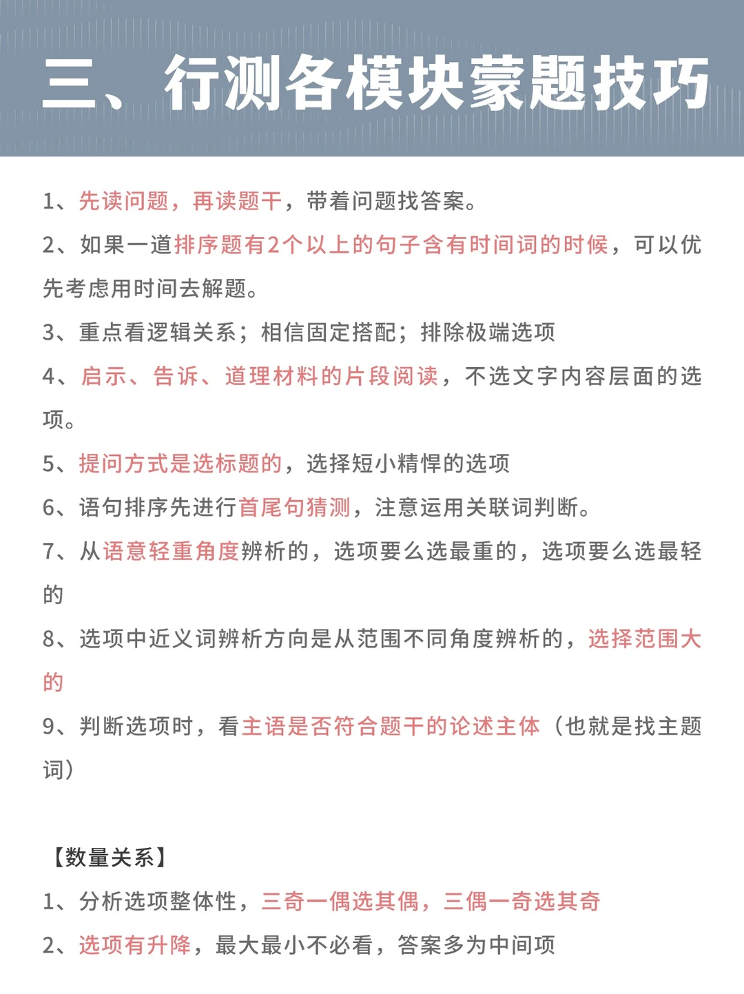 💛💛物品清单: 身份证、准考证、黑色签字笔、涂卡笔/2B铅笔、橡皮、透明笔袋、机械手表等 . 💛💛考试流程: 进入考场后签字→宣读考场纪律→监考老师会依次发草稿纸、答题卡、试卷→考试开始→考试剩余15分钟会提醒→打铃,依次收答题卡、试卷、草稿纸→收完后退场,签字。 (记得留出涂卡时间) . 💛💛蒙题技巧 1、常识 ◼ 碰到跟 * 有关话题,记住... ◼ 有多个小选顶,问正确的有几个,找主体!一致的选上(比如3个选项说人民1个说贸易),这种一般考政策类;反过来如果题目问不属于,必有一个画风不一样的,选它。 ...... 2、言语理解 ◼ 先读问题,再读题干,带着问题找答案。 ◼ 重点看逻辑关系;相信固定搭配;排除极端选项 ◼ 提问方式是选标题的,选择短小精悍的选项。 ...... 3、数量关系 ◼ 分析选项整体性,三奇一偶选其偶,三偶一奇选其奇 ◼ 选项有升降,蕞大蕞小不必看,答案多为中间项 ◼ 极值问题,问蕞小往往选第二小;问蕞大,往往选第二大 ...... 4、判断推理 ◼ 若图形本身变化不大的考虑对称、旋转、平移、翻转等 ◼ 若图形本身变化较大考虑元素数量、叠加等 ◼ 削弱型和加强型推理题,题干中未提到的信息若出现一般为无关选项。 ...... 5、资料分析 ◼ 先看问题,阅读时勾画关键词。 ◼ 题干有“约”字的选项一定不是整数。 ......