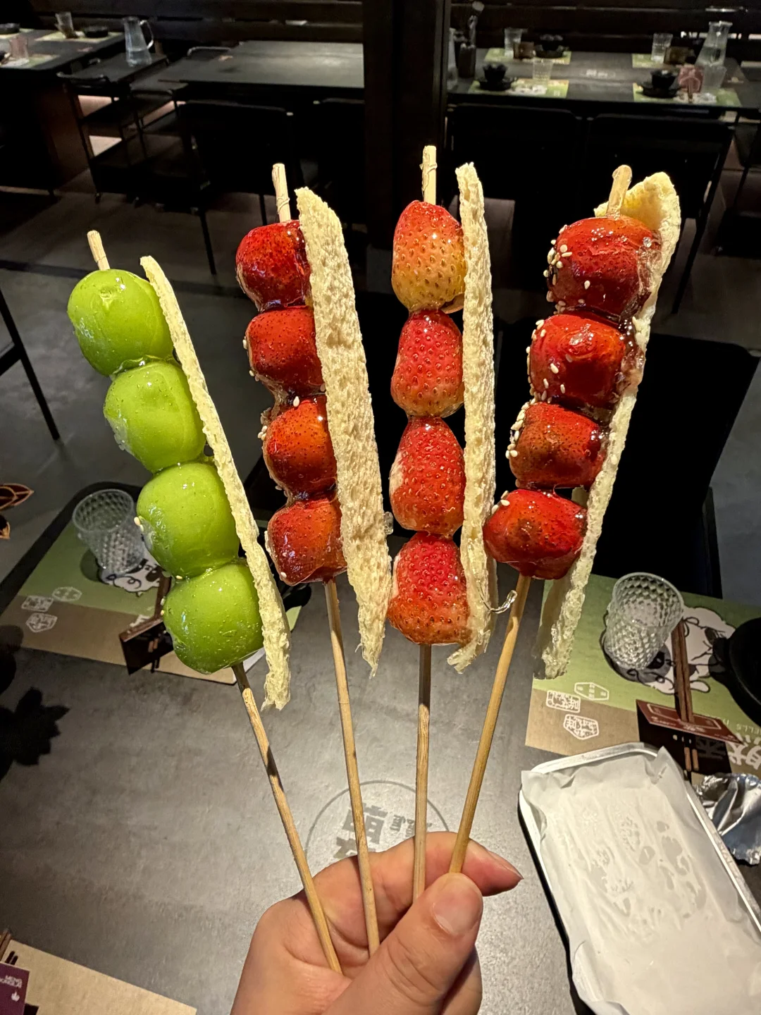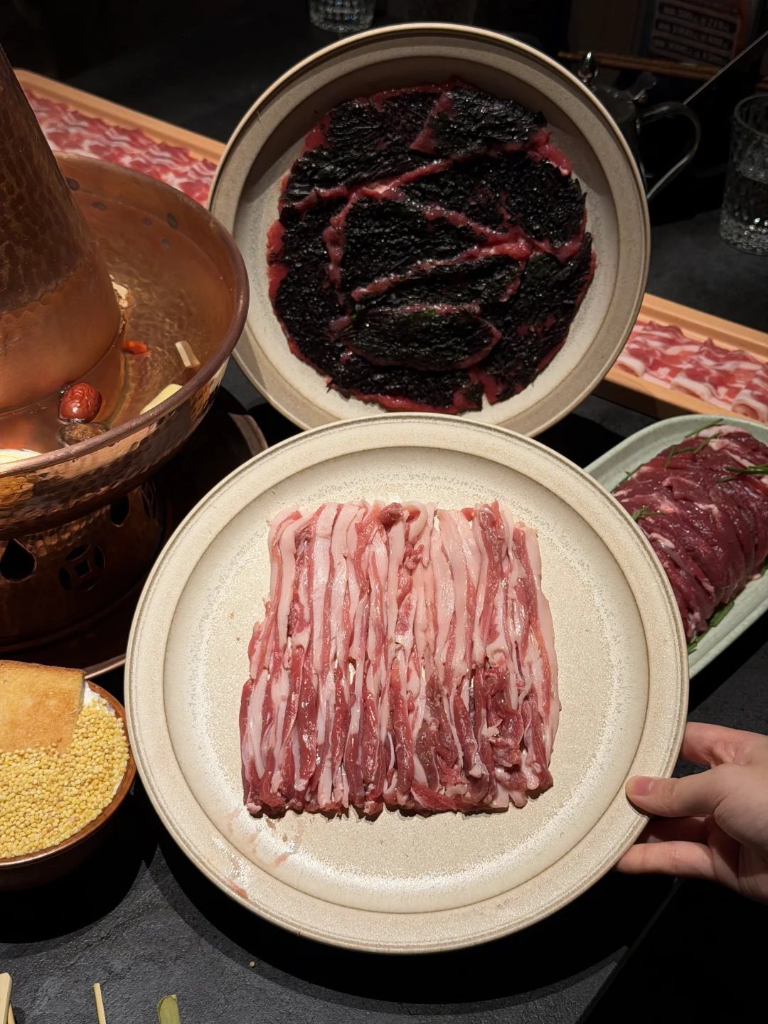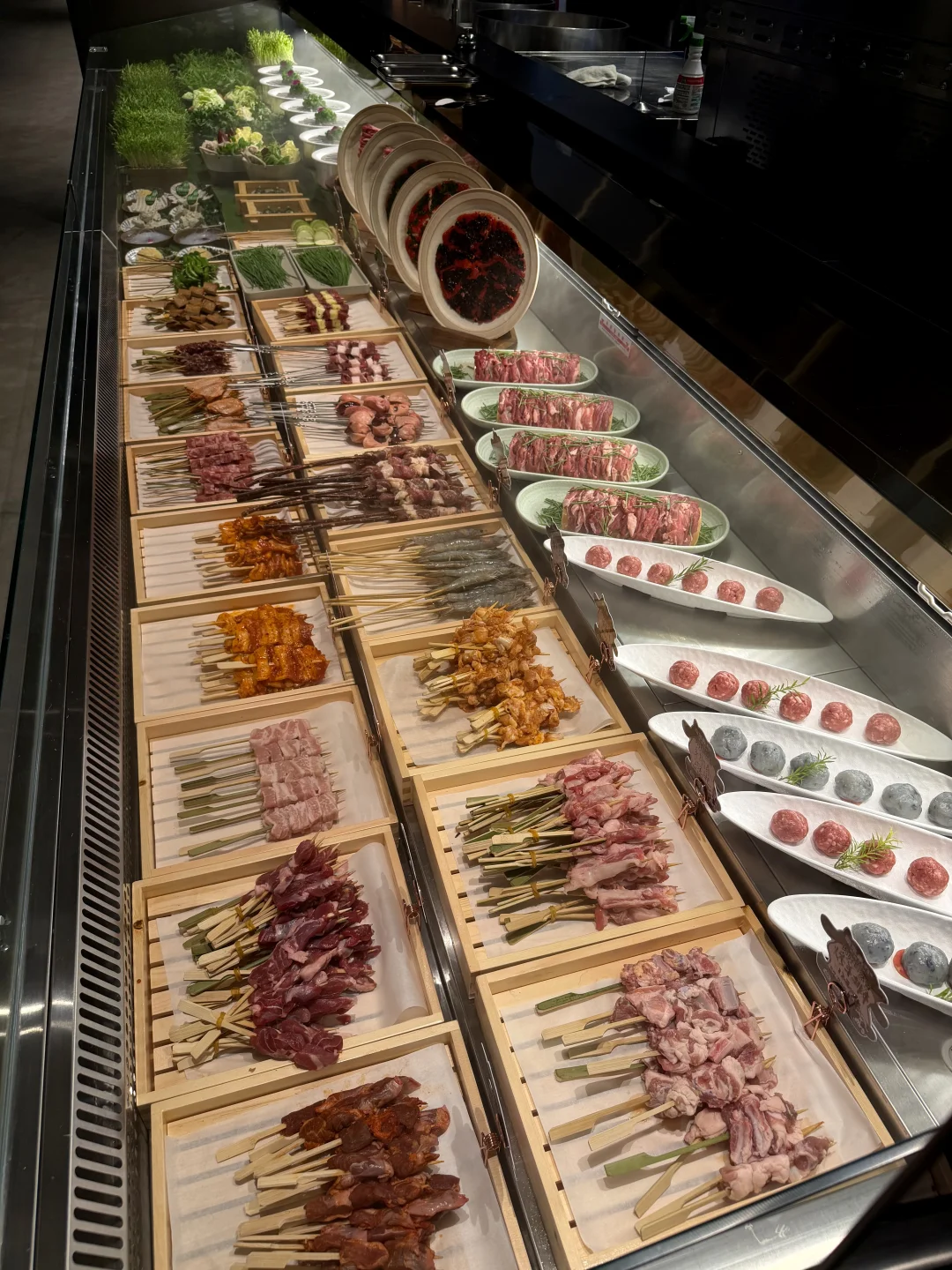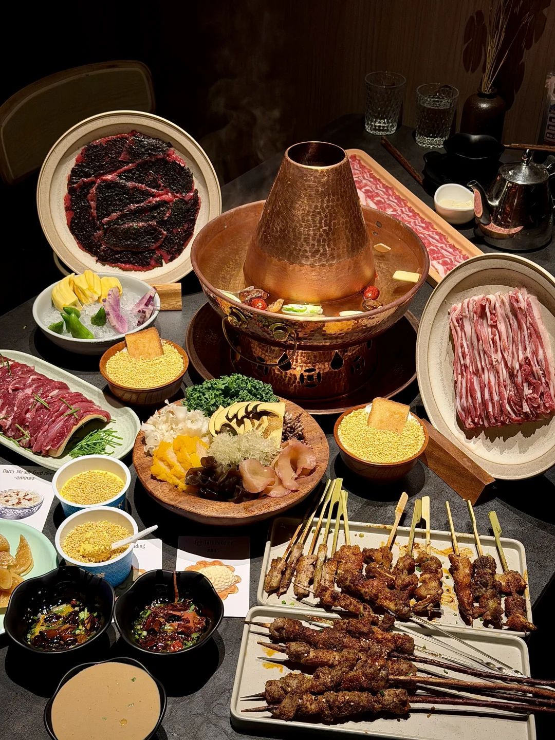 成都南门新开的一家涮烤牛羊店!专门坐地铁去吃的!去的时候展示柜里摆满了新鲜的牛羊肉,很有烟火气!! 我们四个人点了5盘肉+20串烤串!肉都很鲜嫩,吃不出来很重的膻味!还有很多有特色的甜品,小羊布丁蛋挞、达西马拌炒米、奶嚼口拌炒米(用黄油烤面包蘸着吃)、奶皮子糖葫芦…把我们吃爽了的!!!很多都是一大家子来吃,很适合降温后的成都!!