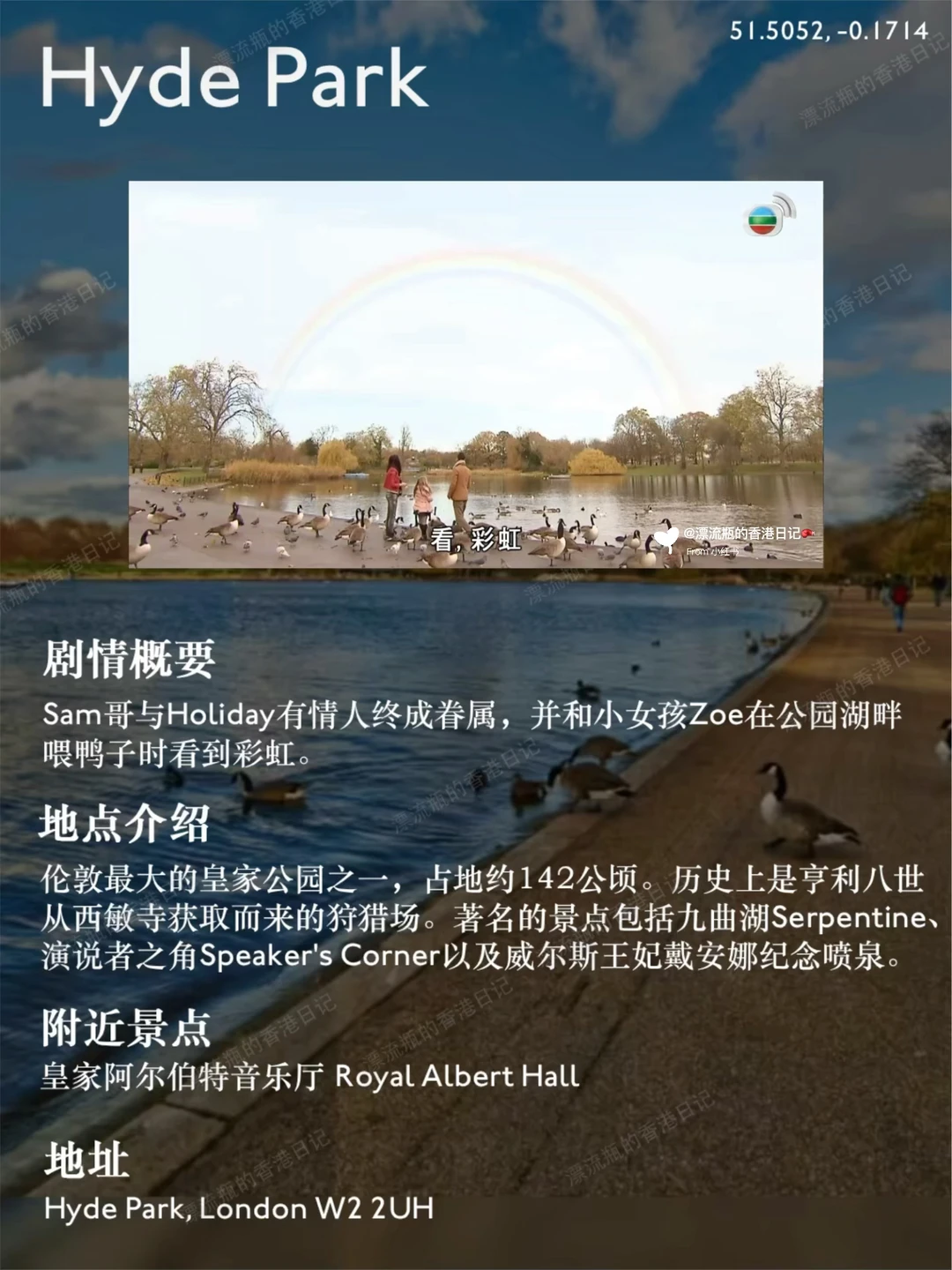 要是喜欢大自然,无论是Holiday住处附近的Alexandra Park眺望伦敦的天际线,还是白金汉宫附近的海德公园看看鸭子🦆在好天气的日子走到这里,就能感觉到路是无限宽广。或者还能像Sam哥和Holiday在结局一样,看见悬挂天际的彩虹🌈