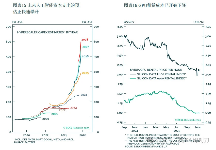 这种扩张已显著依赖外部债务。Meta Platforms 发行了约300亿美元的债务来资助其数据中心建设 。微软的CapEx预计在2026年将增长36%,总额超过1200亿美元 。这种 CapEx 规模预示着行业供给侧正快速接近饱和。如果市场的AI应用需求(如真正的AI商业化)是渐进式的,而非指数级的,那么2025-2026年集中释放的产能将远远超过短期需求,这正是历史上所有 CapEx 泡沫见顶前的典型特征。