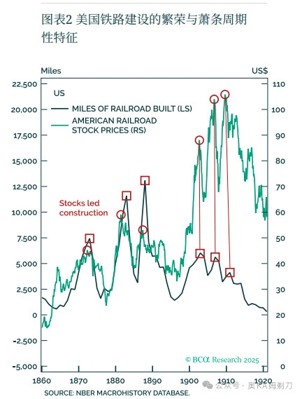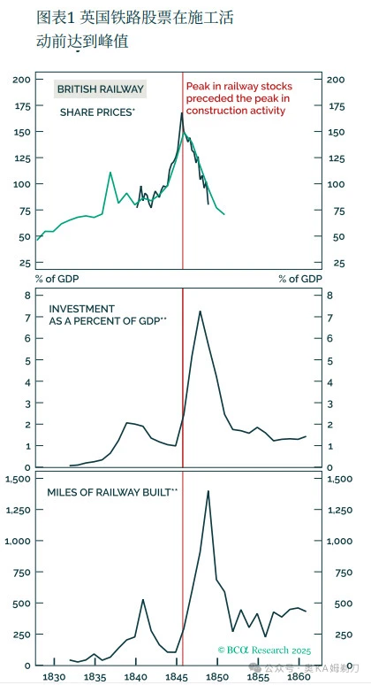 - 英国铁路热潮:1830年利物浦-曼彻斯特铁路的开通引发建设热潮,1847年铁路建设支出占GDP比重达7%,随后流动性收紧引发危机,铁路指数较峰值下跌65%。