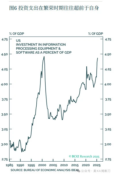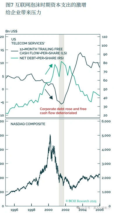 - 科技相关资本支出占GDP比重从1992年的2.9%升至2000年的4.5%,纳斯达克综合指数1995-2000年上涨6倍,此后两年半下跌78%。