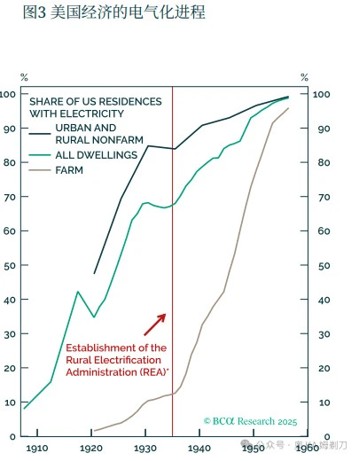 - 美国家庭通电比例从1907年的8%升至1930年的68%,但农村电气化滞后。1929年股市崩盘后,1932年最大公用事业集团英萨尔集团破产,电力公用事业建设支出从1930年的9.19亿美元暴跌至1933年的1.29亿美元。