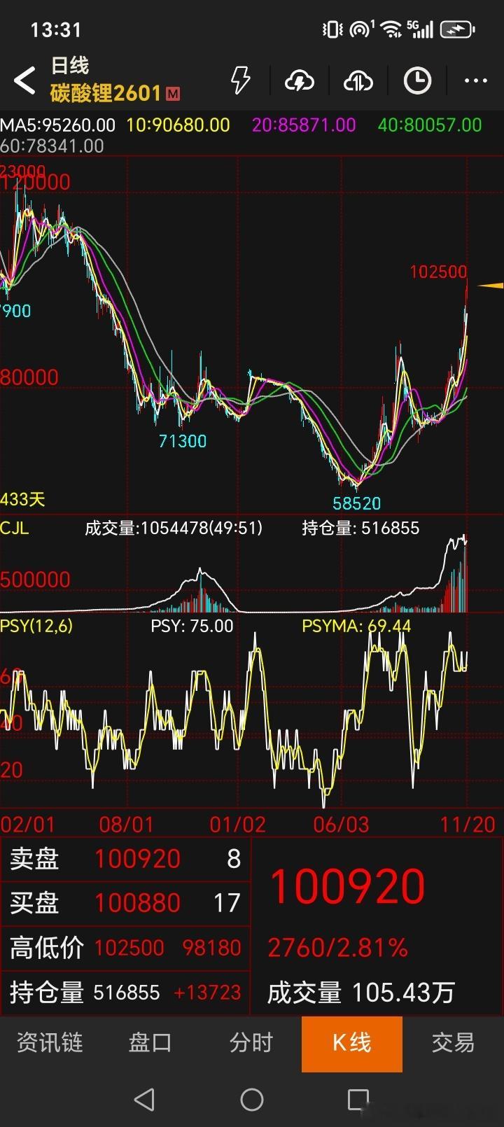 碳酸锂今天继续北上,上午开盘后平仓了6手,目前还剩5手底仓,继续持有。盈利还可以!说了站稳9万基本10万就稳了!