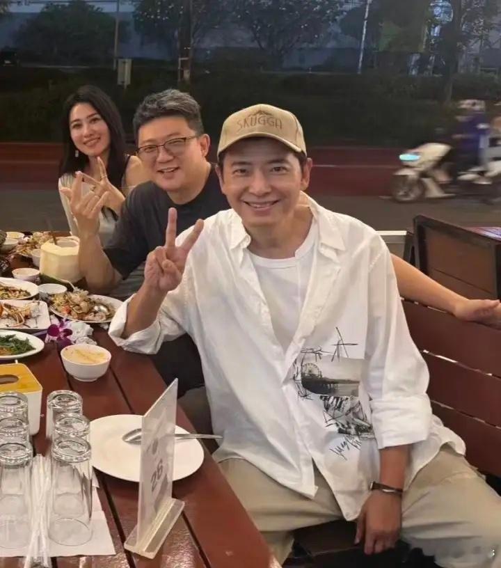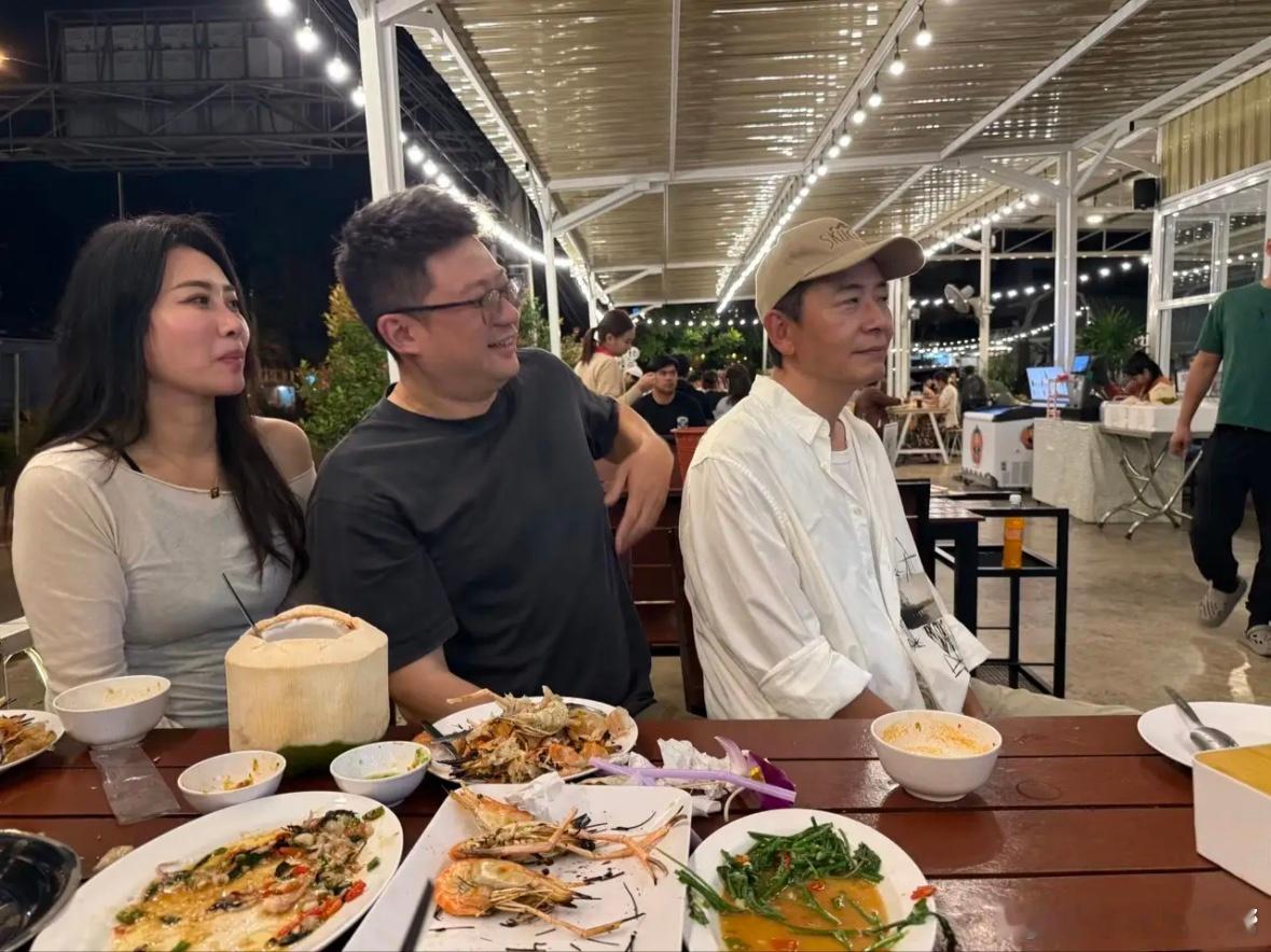 54岁戴军和朋友在泰国曼谷一家餐厅吃海鲜大餐,他的打扮年轻时尚,身材很瘦,皮肤也晒黑了,但整个人状态很不错,笑起来像个小男生。