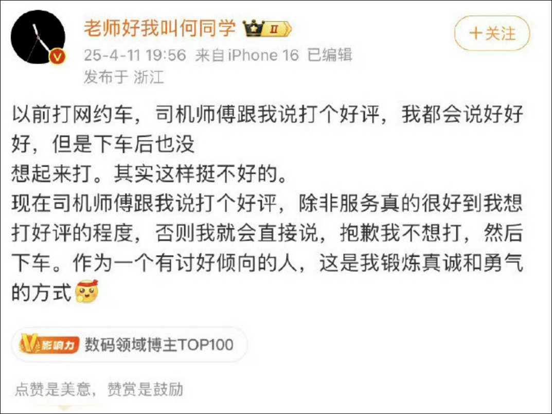 今年4月11日,何同学曾发博称:“以前打网约车,司机师傅跟我说打个好评,我都会说好好好,但是下车后也没想起来打。其实这样挺不好的。现在司机师傅跟我说打个好评,除非服务真的很好到我想打好评的程度,否则我就会直接说,抱歉我不想打,然后下车。作为一个有讨好倾向的人,这是我锻炼真诚和勇气的方式。”