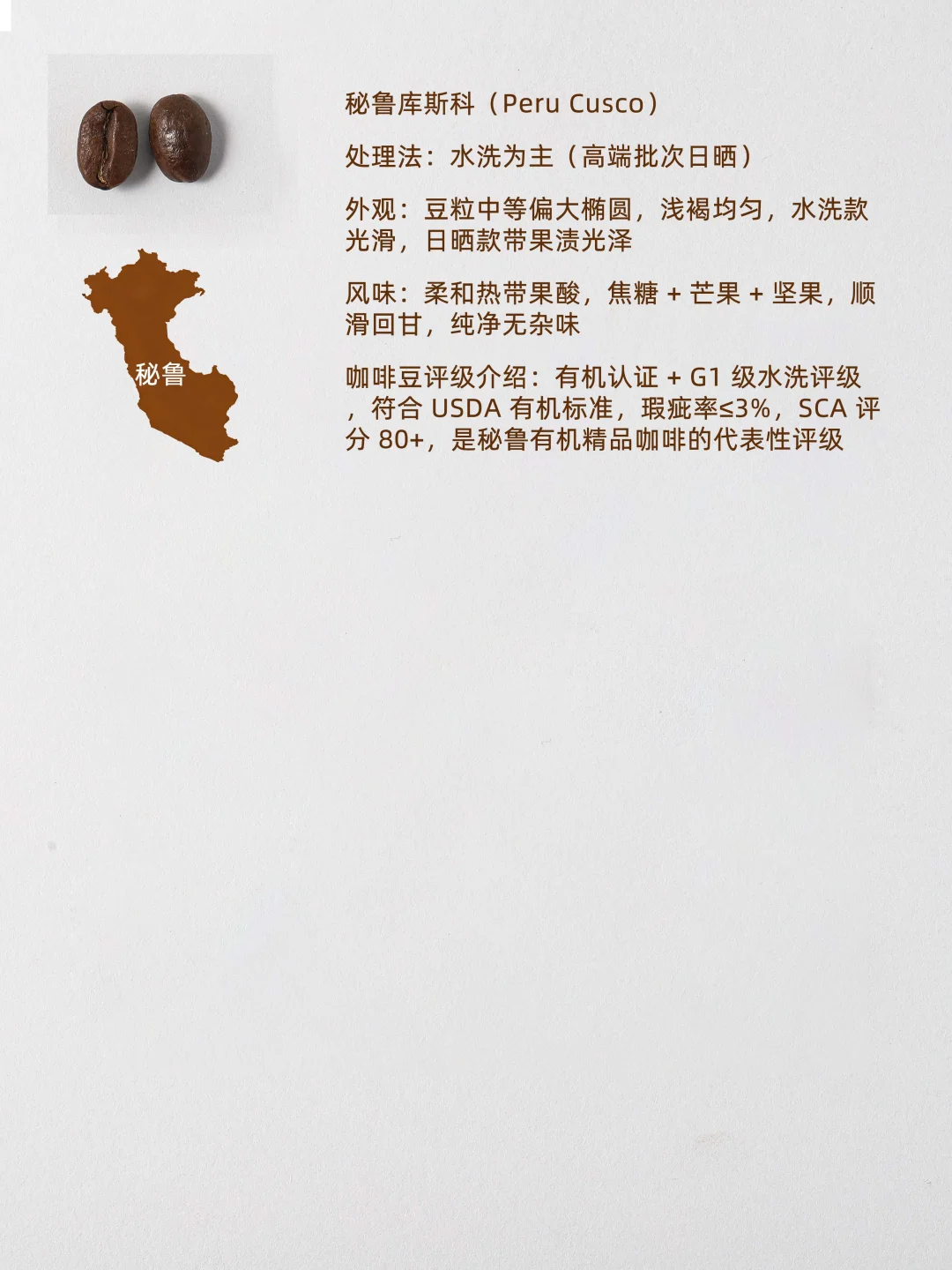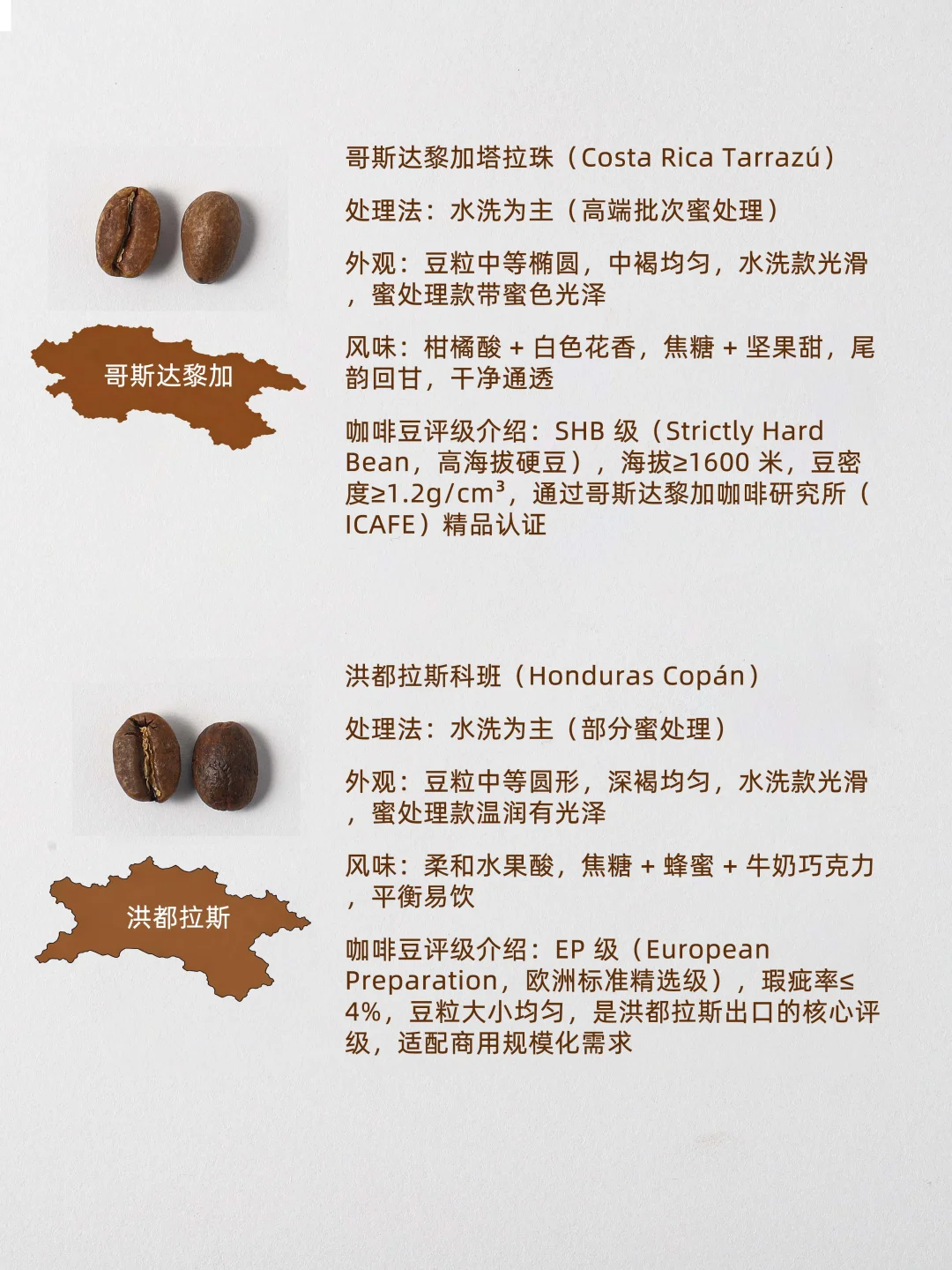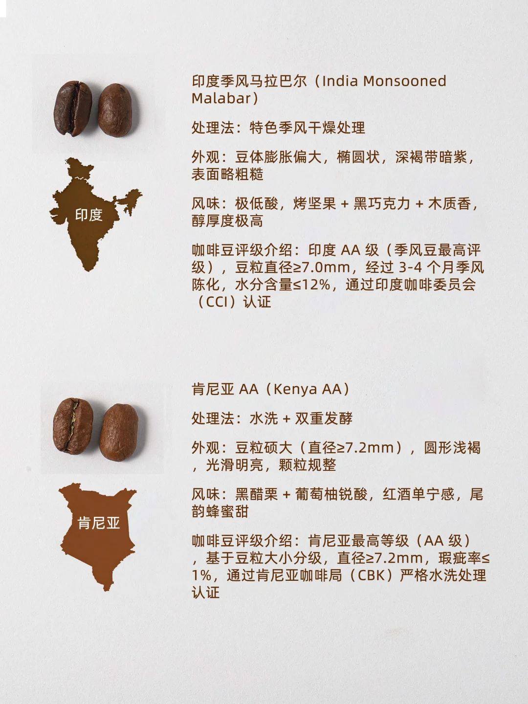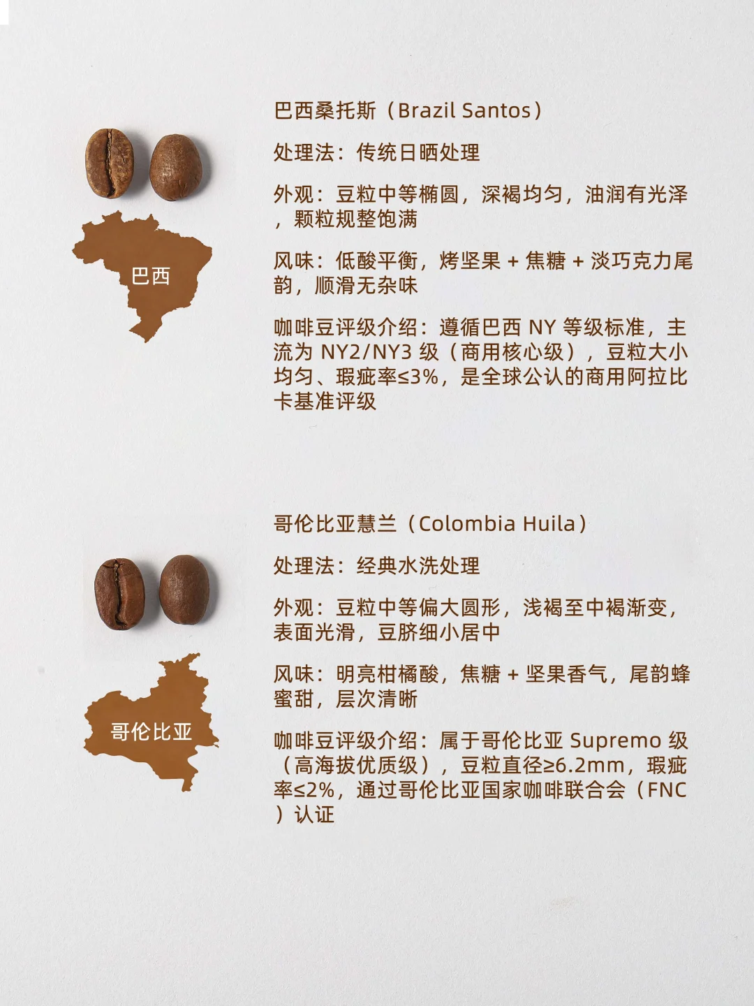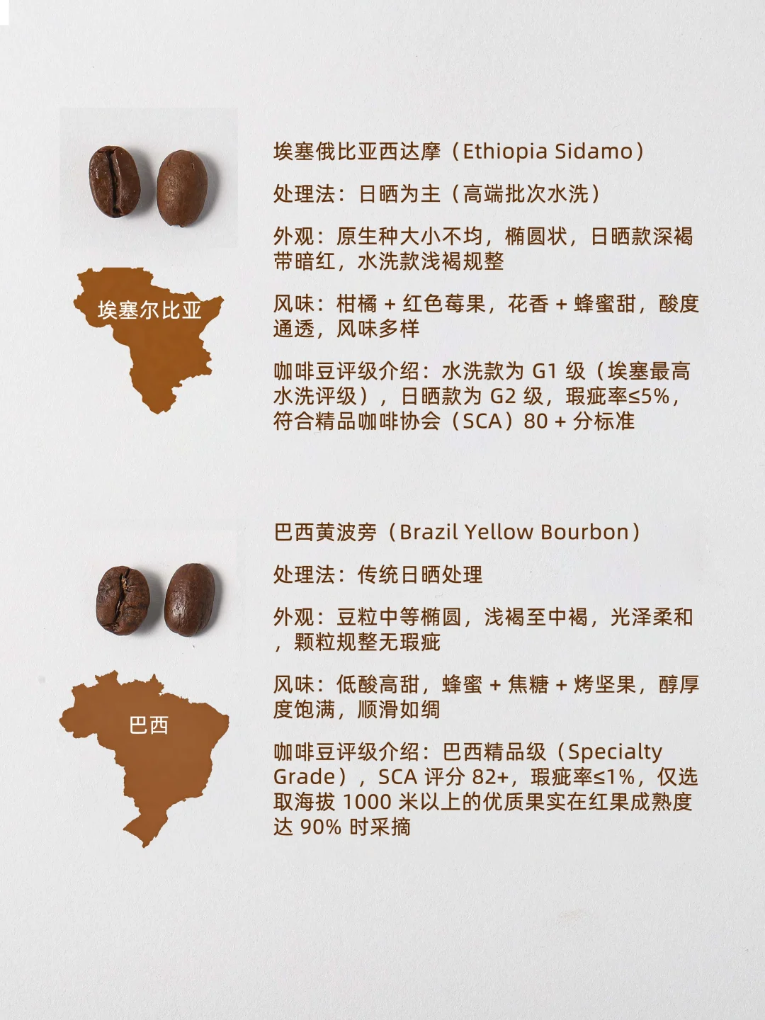 1. 巴西桑托斯(Brazil Santos) 处理法:传统日晒 外观:中等椭圆,深褐均匀,油润规整 风味:低酸平衡,烤坚果 + 焦糖 + 淡巧克力,顺滑无杂味 评级:巴西 NY2/NY3 级,瑕疵率≤3%,商用阿拉比卡基准 2. 哥伦比亚慧兰(Colombia Huila) 处理法:经典水洗 外观:中等偏大圆形,浅褐渐变,光滑,豆脐居中 风味:柑橘酸,焦糖 + 坚果,尾韵蜂蜜甜,层次清晰 评级:Supremo 级(≥6.2mm),瑕疵率≤2%,FNC 认证 3. 埃塞俄比亚西达摩(Ethiopia Sidamo) 处理法:日晒为主(高端水洗) 外观:原生种不均,日晒深褐带红,水洗浅褐规整 风味:柑橘 + 莓果 + 花香,蜂蜜甜,酸度通透 评级:水洗 G1 / 日晒 G2,瑕疵率≤5%,SCA80+ 4. 巴西黄波旁(Brazil Yellow Bourbon) 处理法:传统日晒 外观:中等椭圆,浅褐,光泽柔和,无瑕疵 风味:低酸高甜,蜂蜜 + 焦糖 + 坚果,醇厚度饱满 评级:精品级,SCA82+,瑕疵率≤1%,海拔≥1000 米 5. 印度季风马拉巴尔(India Monsooned Malabar) 处理法:特色季风干燥 外观:膨胀偏大,深褐带紫,表面略糙 风味:极低酸,烤坚果 + 黑巧克力 + 木质香,高醇厚 评级:印度 AA 级(≥7.0mm),3-4 个月陈化,CCI 认证 6. 肯尼亚 AA(Kenya AA) 处理法:水洗 + 双重发酵 外观:硕大(≥7.2mm),圆形浅褐,光滑明亮 风味:黑醋栗 + 葡萄柚锐酸,红酒感,尾韵甜 评级:最高 AA 级,瑕疵率≤1%,CBK 认证 7. 哥斯达黎加塔拉珠(Costa Rica Tarrazú) 处理法:水洗为主(高端蜜处理) 外观:中等椭圆,中褐,水洗光滑,蜜处理带蜜光 风味:柑橘酸 + 花香,焦糖 + 坚果,尾韵回甘 评级:SHB 级,海拔≥1600 米,ICAFE 认证 8. 洪都拉斯科班(Honduras Copán) 处理法:水洗为主(部分蜜处理) 外观:中等圆形,深褐,水洗光滑,蜜处理温润 风味:柔和果酸,焦糖 + 蜂蜜 + 牛奶巧克力,平衡易饮 评级:EP 级,瑕疵率≤4%,商用核心 9. 秘鲁库斯科(Peru Cusco) 处理法:水洗为主(高端日晒) 外观:中等偏大椭圆,浅褐,水洗光滑,日晒带果渍光 风味:热带果酸,焦糖 + 芒果 + 坚果,顺滑回甘 评级:有机 + G1 级,USDA 认证,SCA80+