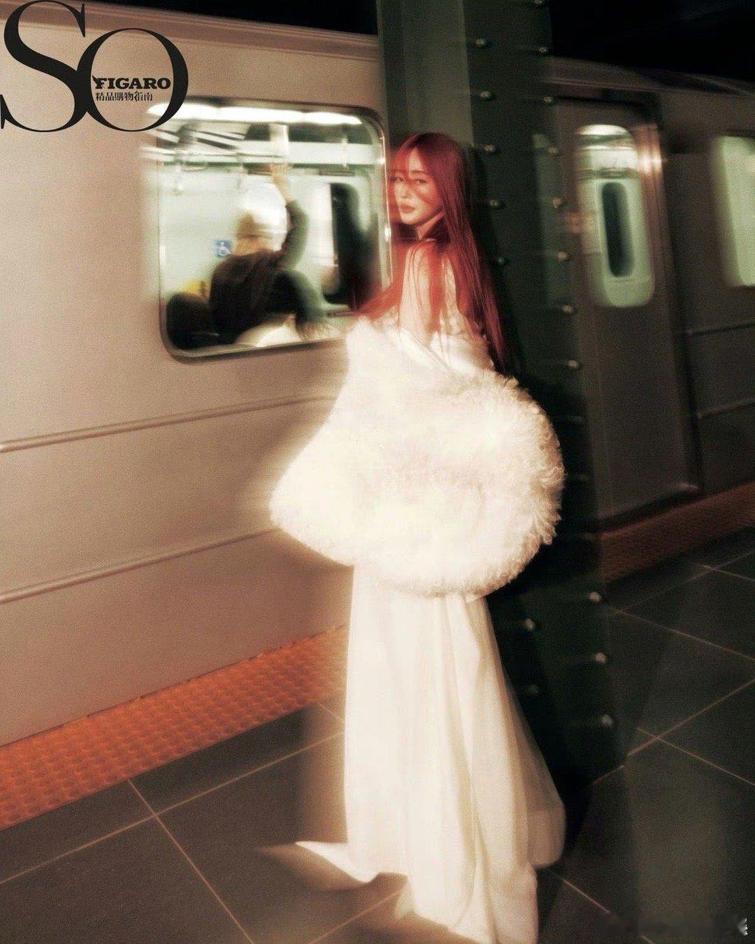 行走的时尚画报再升级!张天爱红发白翼造型在地铁站中演绎别样故事,每个角度都充满戏剧张力。