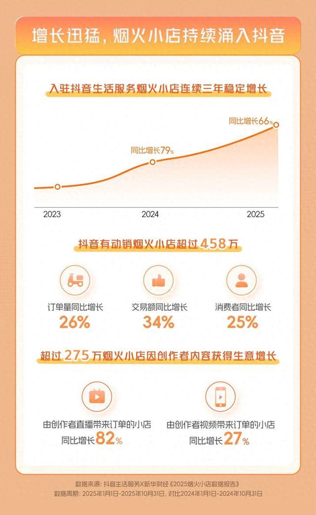 11月20日,抖音生活服务联合新华财经发布《2025烟火小店数据报告》,呈现一年来抖音烟火小店的发展态势以及平台助力烟火小店发展做出的努力。报告显示,抖音烟火小店新入驻数量连续三年稳定增长,交易额同比增长34%;超2.2万个烟火小店抖音年销售额超百万。