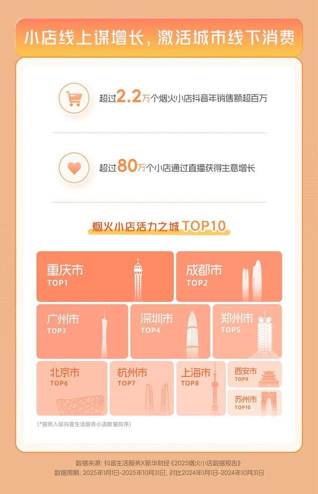 内容种草与线上经营的深度融合,正持续激活城市线下消费活力,将数字世界的“烟火气”延伸至真实街巷。报告显示,今年以来,抖音平台上有超过2.2万家小店年销售额突破百万元,超80万家借助直播实现生意增长。