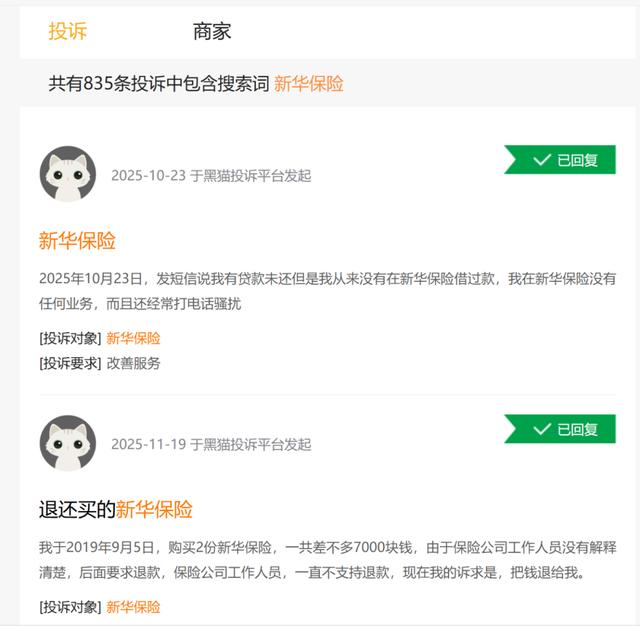 黑猫投诉平台搜索“新华保险”有835条记录,内容多是误导消费者、虚假宣传、霸王条款等。