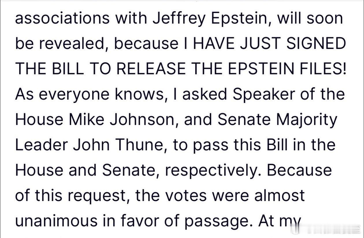 总统已签“公布Epstein档案”令按规定,司法部长三十天内执行T在社媒上已指明方向:是我同意,才通过的…我同意公布,因为Epstein及其同伙,都是民主党