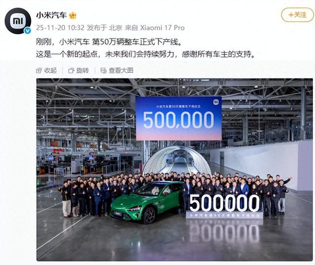 今日10点32分,小米汽车官方微博发文表示,刚刚,小米汽车第50万辆整车正式下产线。