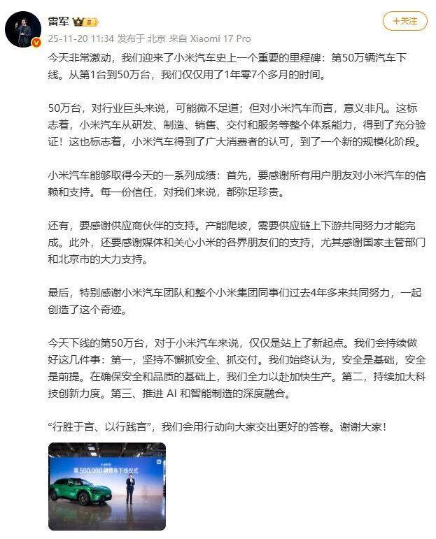 雷军随后在其个人微博发文表示,今天非常激动,迎来了小米汽车史上一个重要的里程碑:第50万辆汽车下线。从第1台到50万台,仅仅用了1年零7个多月的时间。