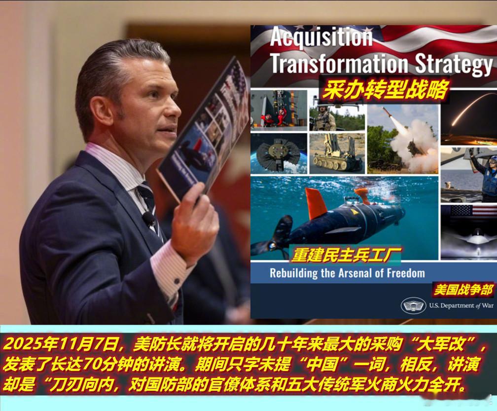 图1:在高市早苗口吐狂言的当天;图2/3:美防长发表了70分钟“大军改”愿景的讲演,其中只字未提中国,反而是“刀刃向内”火力全开;图4:几天后,美陆军部长也效仿,对五大传统军火商进行了猛烈抨击。问题是:作为军事介入台海杀伤链的设计者和主导者,美军方此时为何不力挺高市早苗呢?毕竟高市第一次说出了假设在“存亡危机事态”下台湾可被日本保安法视为“外国”哦。