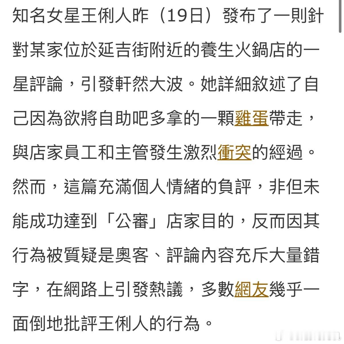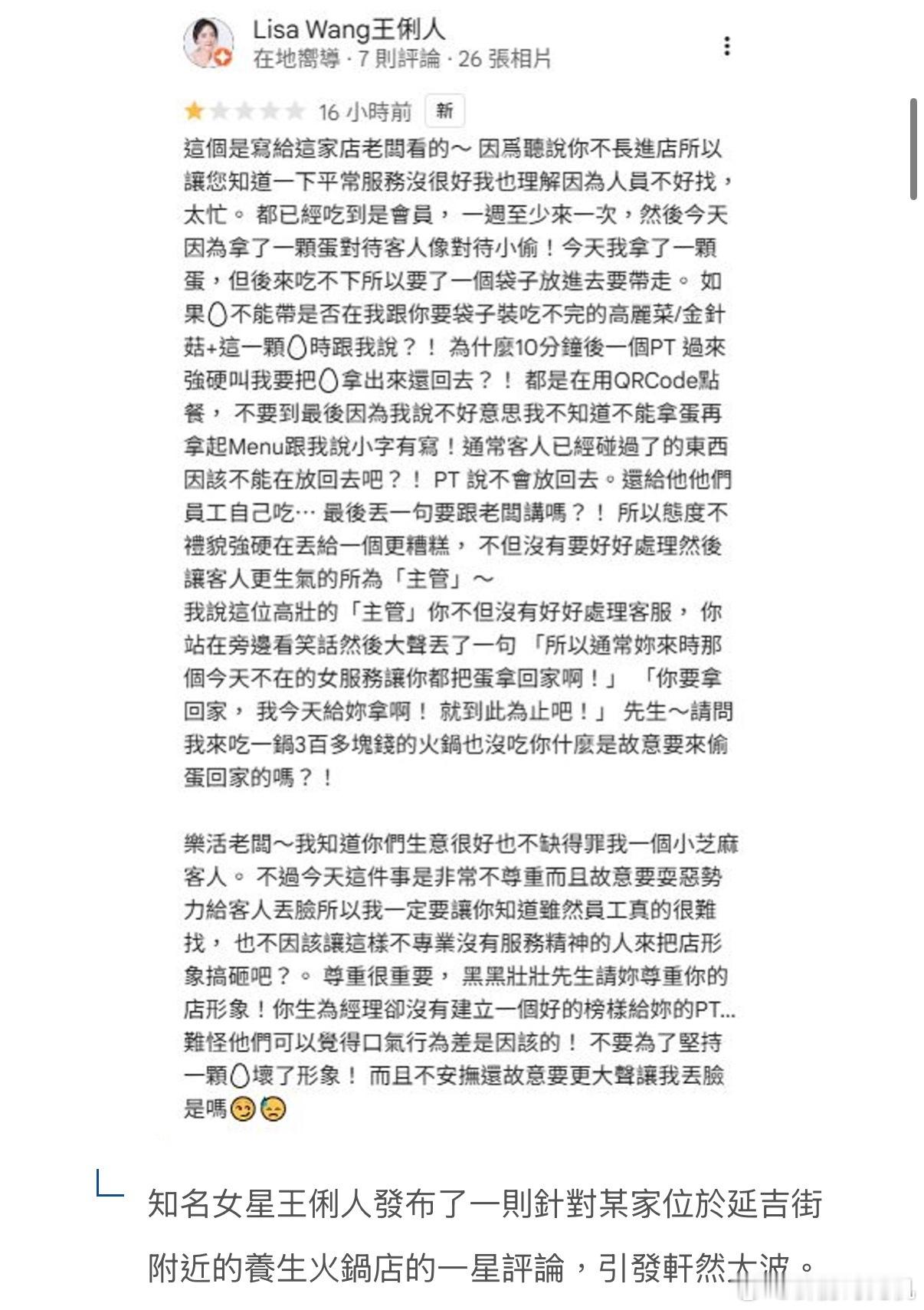 王俐人吃自助火锅想把多拿的一颗鸡蛋带走,与店家员工和主管发生争执后,发文晒了给店家打一星的图,引发质疑