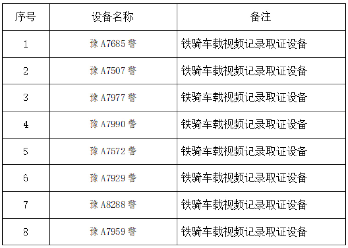 为强化城区道路交通秩序管理,提高科技化管理水平,郑州市公安局交通管理支队在城区新增8套“铁骑车载视频记录取证设备”,将从2025年11月28日起正式投入使用,11月20日,郑州交警将这批新增的“铁骑车载视频记录取证设备”信息予以公示。