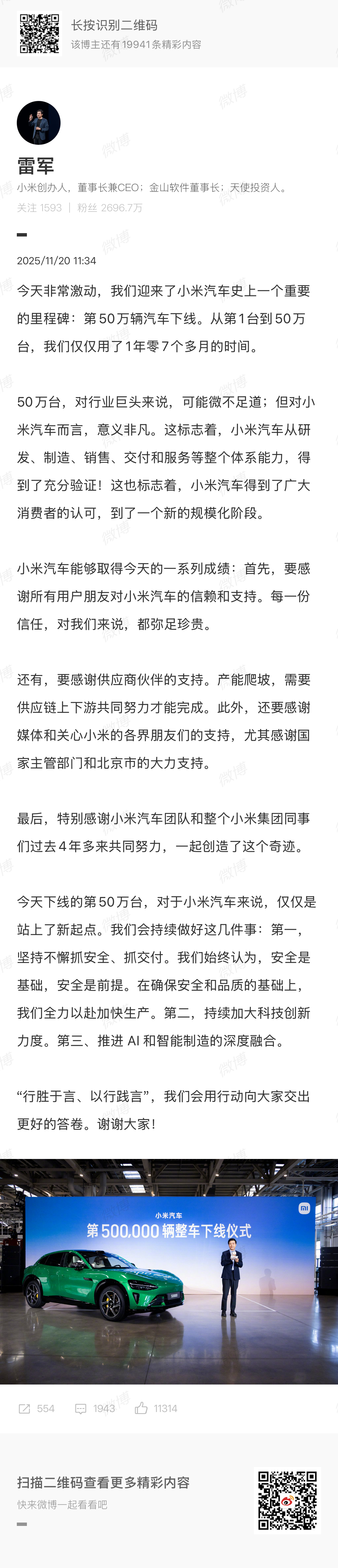 第50万辆小米汽车下线从2024年3月28日SU7发布,到今天的第50万辆下线,只用了602天这速度相当强了
