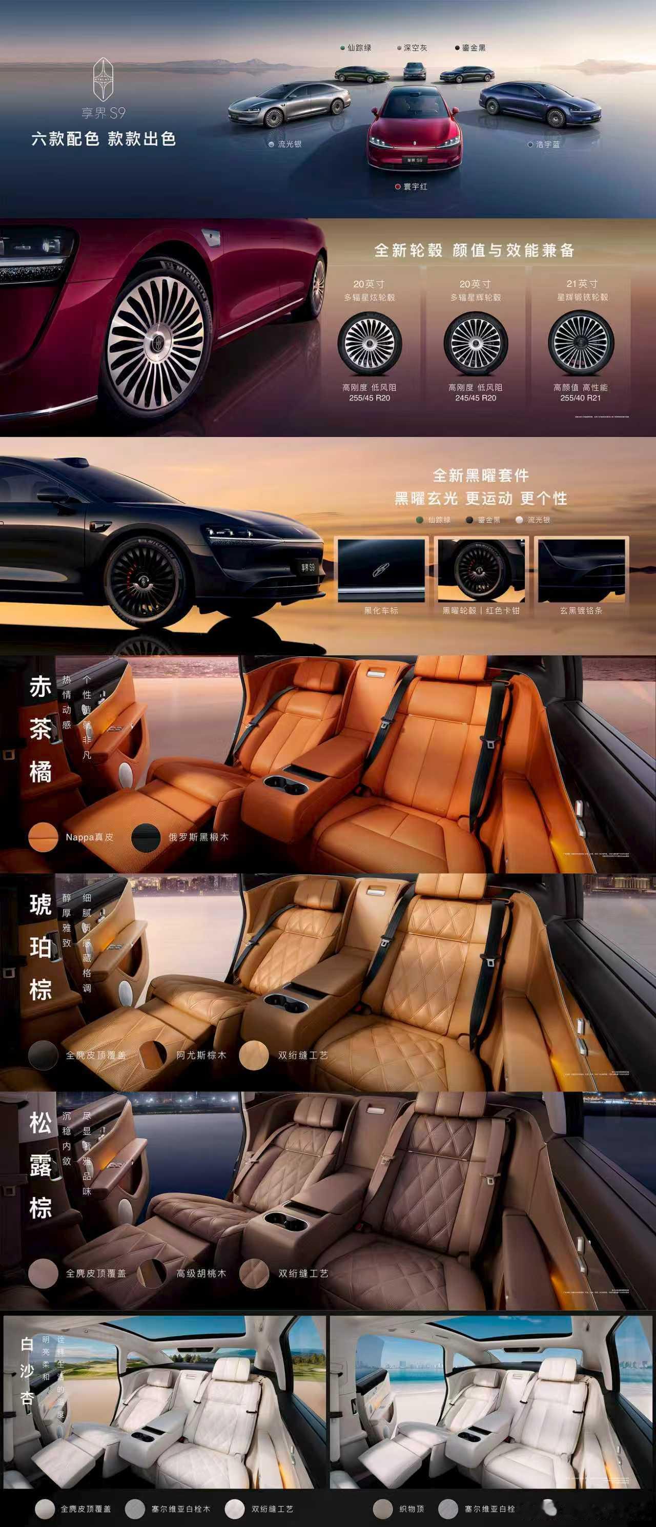 新款享界S9真的好看哈! 全新寰宇之星车标、标志性星河大灯、全新星云尾灯、智慧电动门,华为百万像素智慧投影大灯,升级小狗趴下等多种灯效……重点还有流光银、仙踪绿等共6款寰宇色系,赤茶橘、白沙杏等4种内饰颜色以供选择,提供20英寸多辐星炫轮毂等多种轮毂,另有全新黑曜套件可选,爱了!