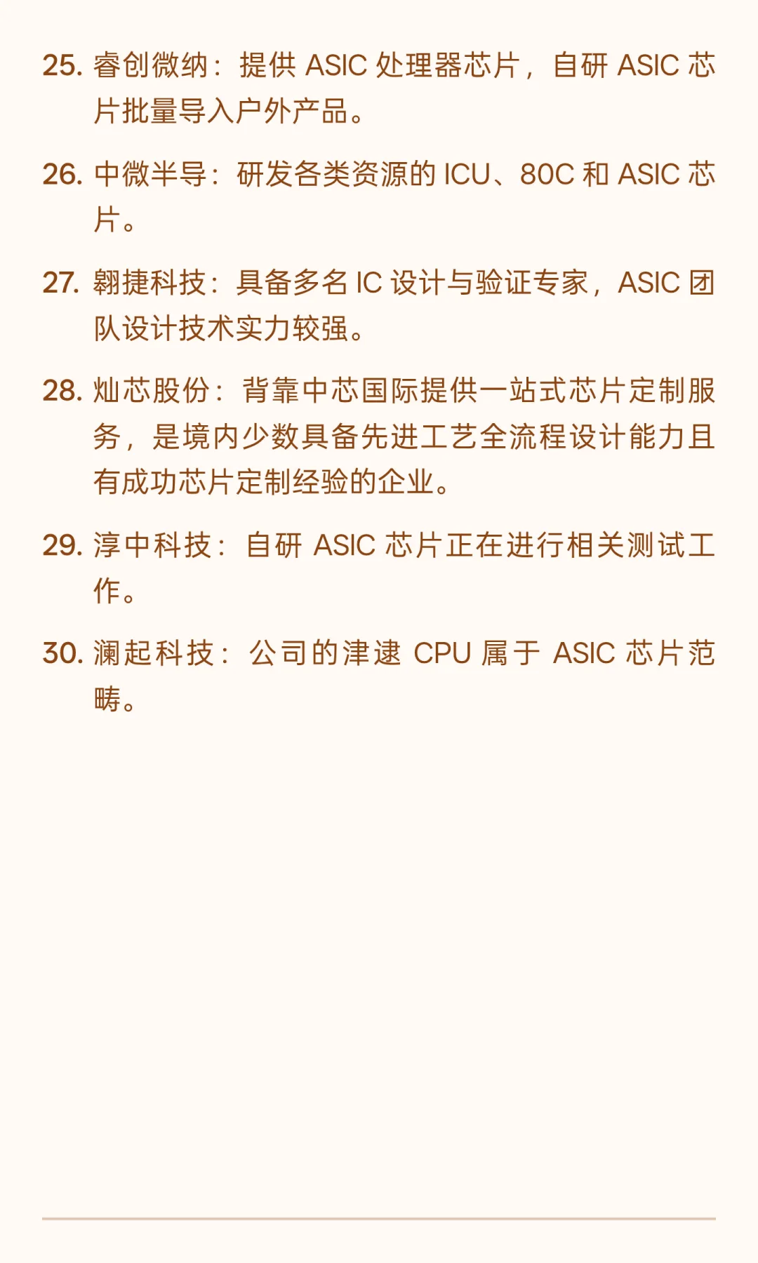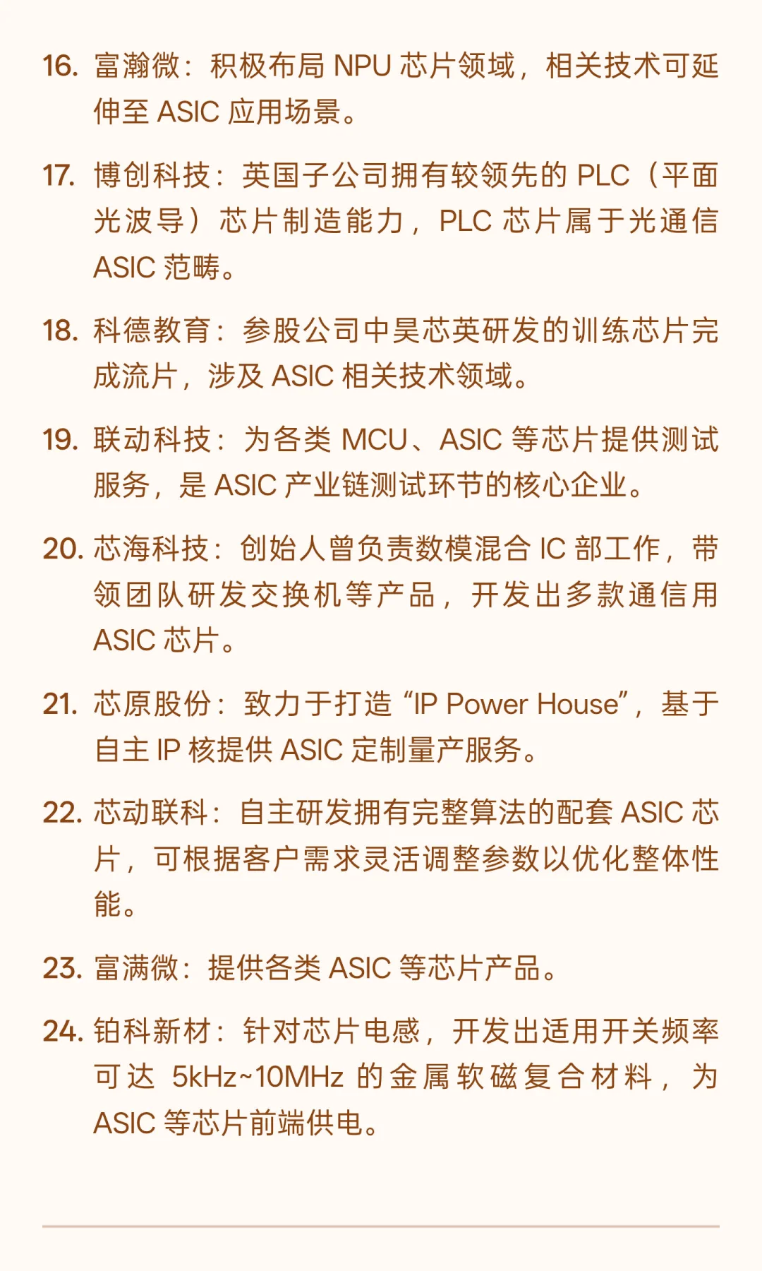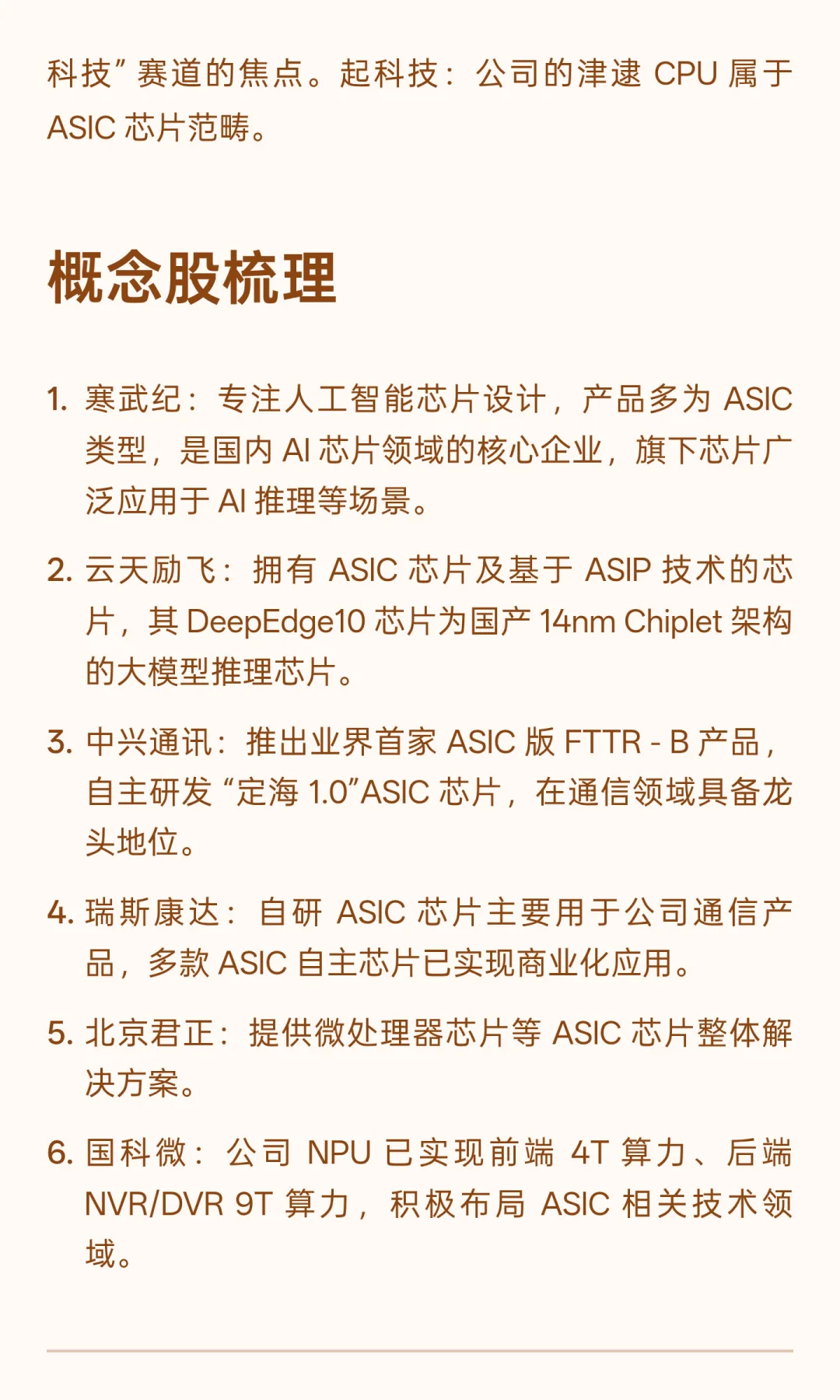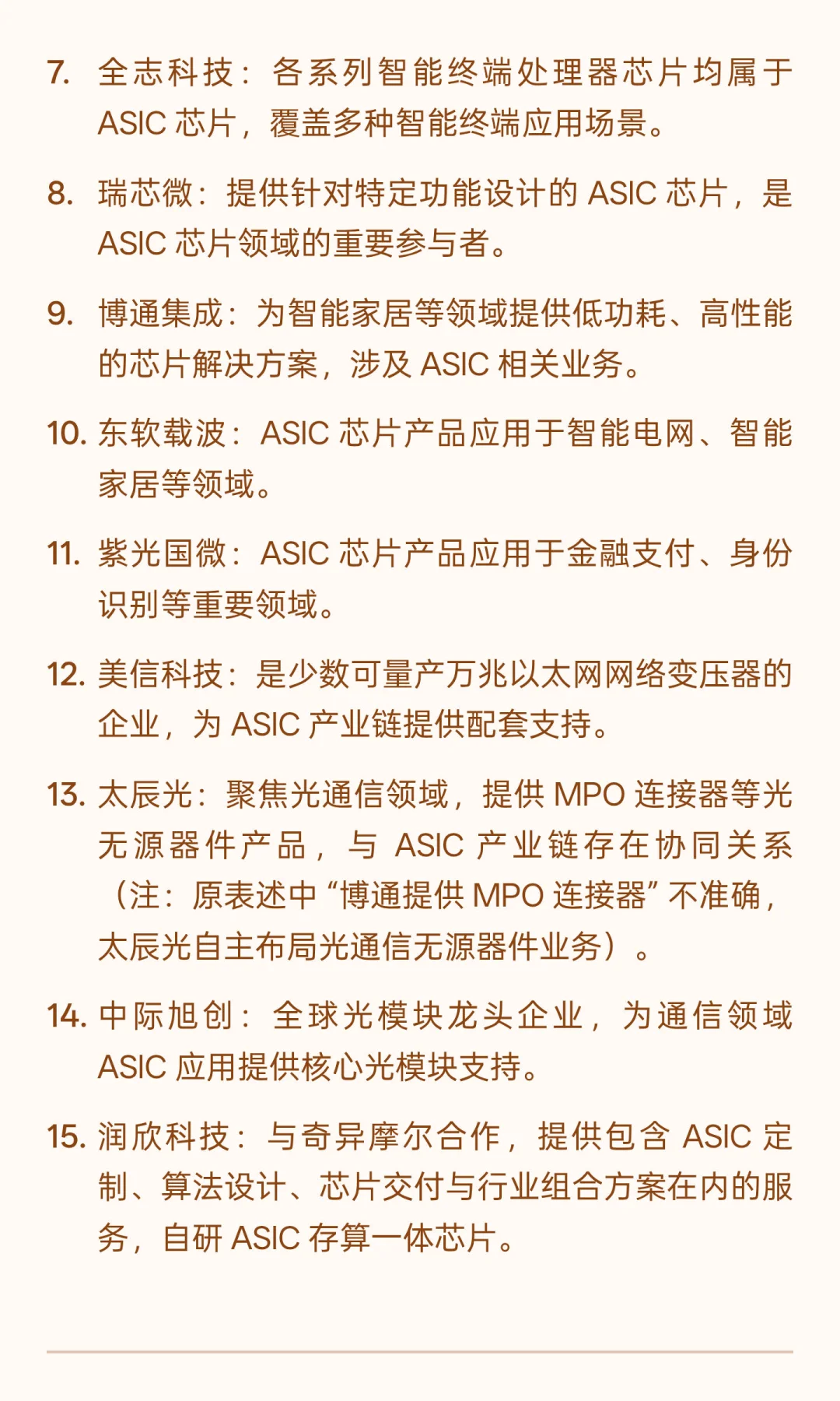 在 AI 领域,ASIC 因 “低功耗 + 高算力密度” 特性,成为大模型推理、边缘计算的核心载体(云端推理 ASIC 能效比可达 GPU 的 5 倍以上);当前,ASIC 产业链从设计、制造到应用端全面升温,相关概念股也成为资本市场 “高成长 + 硬科技” 赛道的焦点。