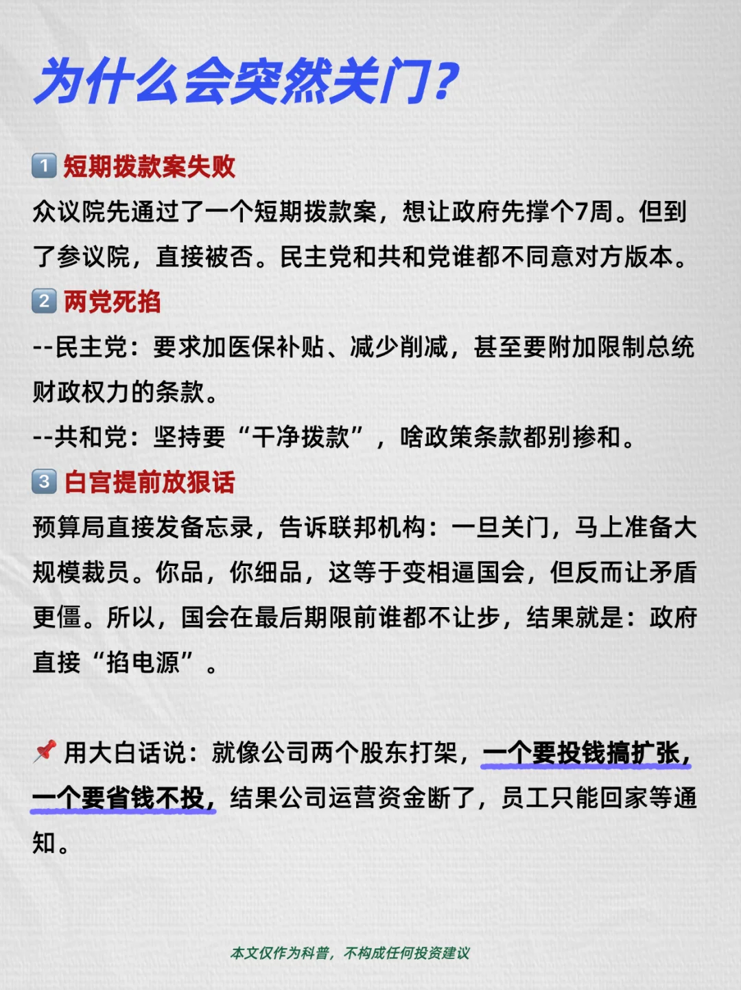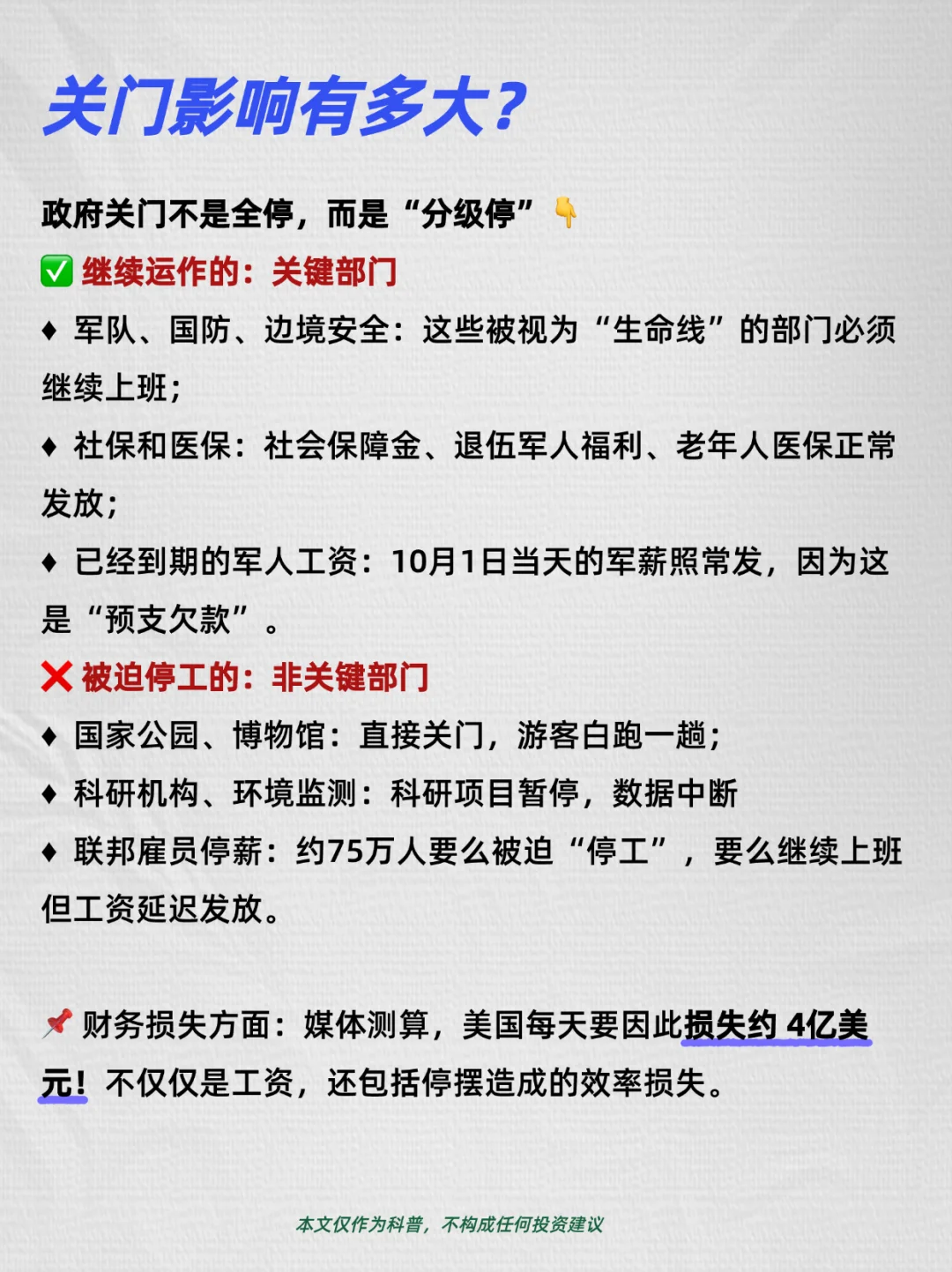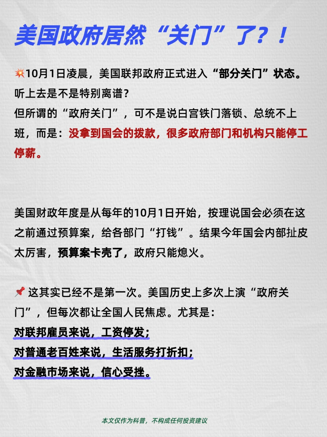 💥突发!美国联邦政府在10月1日正式关门!这一幕不是第一次上演,却依旧牵动全球市场的神经。 为什么美国政府老是“没钱”? 关门会带来哪些影响? 今天我帮大家梳理一遍,用最通俗的大白话带你看懂这场“全球关注的大戏”。