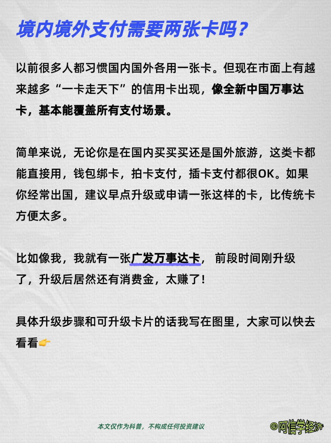 以前很多人都习惯国内国外各用一张卡。但现在市面上有越来越多“一卡走天下”的信用卡出现,像全新中国万事达卡,基本能覆盖所有支付场景。