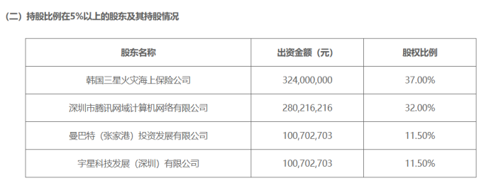 2022年8月,腾讯旗下深圳市腾讯网域计算机网络有限公司出资约2.8亿元参与三星财险增资,获得32%股权,使这家老牌外资独资财险公司转变为中外合资企业。这一持股比例使腾讯成为三星财险第二大股东,但远超一般财务投资的股比,为腾讯提供了足够的董事会话语权和战略影响力。