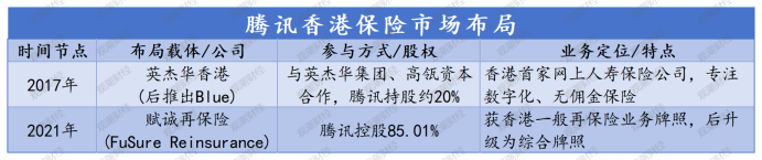 2021年,腾讯控股的香港公司赋诚再保险(FuSureReinsurance)获得香港保监局颁发的“一般再保险业务牌照”。香港保监局资料显示,赋诚再保险获得的是受限制型的一般保险业务牌照,只能在香港从事再保险业务,不得从事直接保险业务。获得该牌照后,腾讯也达到了通过服务直保公司切入保险业务的目的。