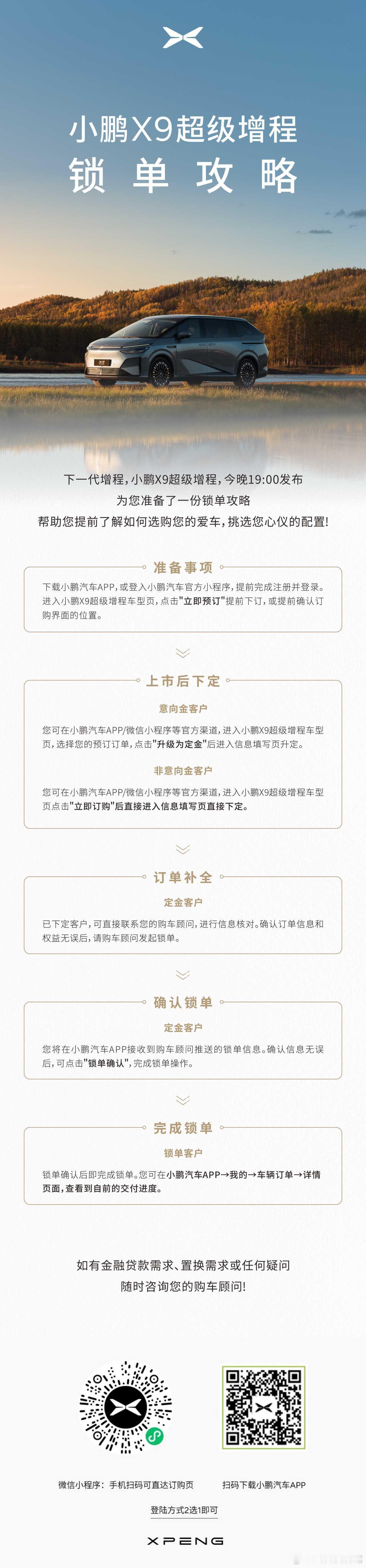 今晚19:00,为家的远行而来!小鹏X9超级增程,即将正式发布!1602km超长综合续航,彻底告别里程焦虑,还有452km纯电续航,日常通勤无压力!更有全球首搭的二排安全气囊零重力座椅、全球首创第三排电动三折叠等,妥妥的“下一代增程”全能王!一台无限接近完美的家庭车,已具备爆款所有潜质!我有点忍不住想换购了!现在唯一的悬念就是:价格! 蹲一个给力好价格,今晚揭晓!