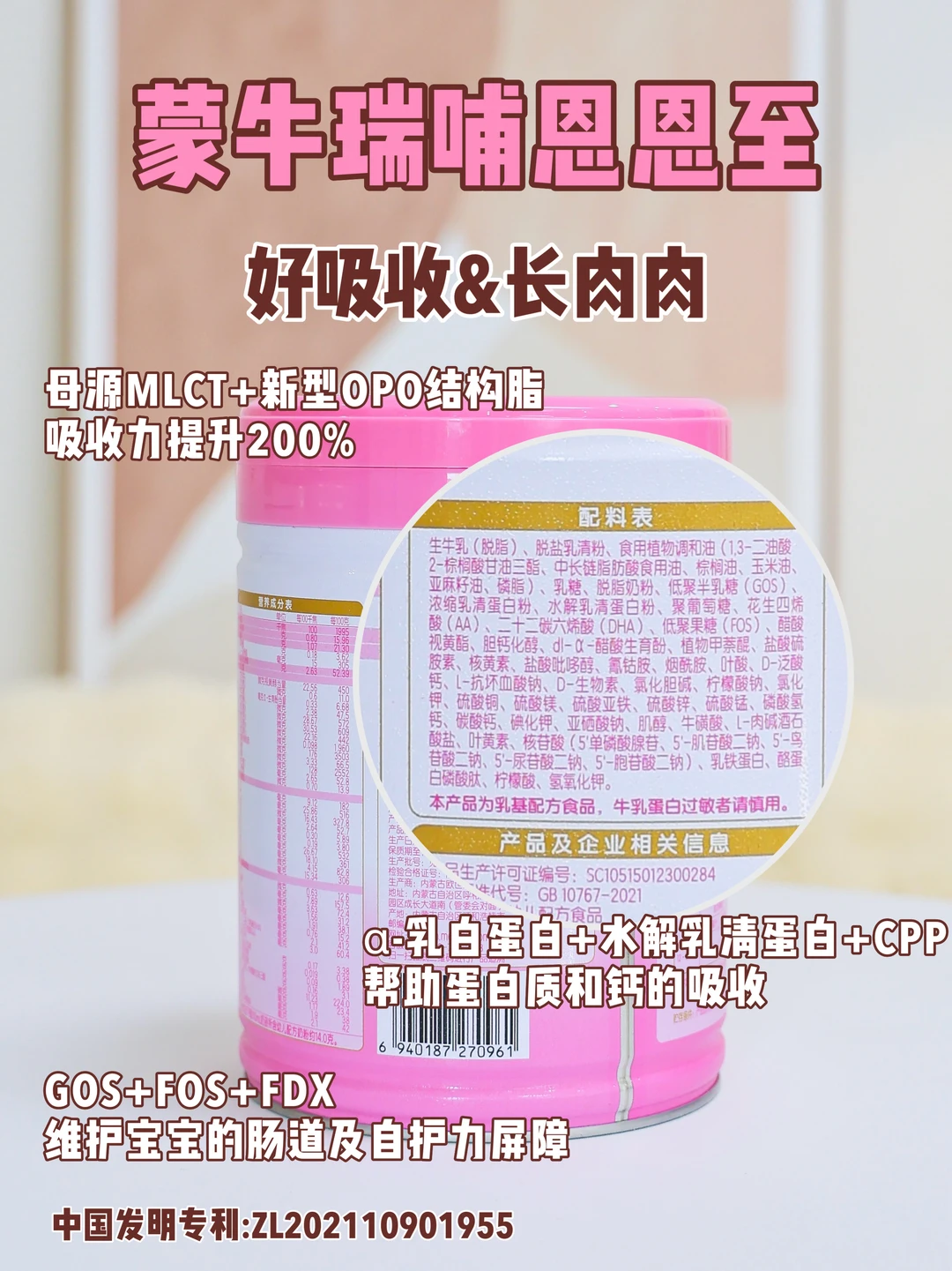 👩自从当了妈妈,我发现身边太多宝妈陷入\"选奶\"怪圈:明明奶粉罐上营养成分表列得满满当当,但宝宝就是光吃不长肉,生长发育曲线不达标这是什么原因❓作为二胎+成分党妈妈,我必须说句大实话:奶粉里的营养成分如果不能被充分吸收,喝再多也是白搭!\n\t\n👩\u200d💻真正有效的长肉配方,核心在于\"油脂微生态\"的平衡。比如添加量超过40%的OPO结构脂能模拟母ru脂肪球膜;📚以及奶粉中关键的脂类营养母源MLCT,它作为母乳中的优质脂肪,更贴近乳源的脂质结构,能够帮助脂肪更好地被宝宝吸收,健康的长肉长壮!\n\t\n🧐搞懂了宝宝长肉的底层逻辑后,我对比多款奶粉,最终锁定蒙牛瑞哺恩恩至,今天就来和大家一起分析下长肉奶粉界真正的\"长肉王“蒙牛瑞哺恩恩至怎么样?\n\t\n➡️顶配吸收,营养不浪费!\n蒙牛瑞哺恩恩至创新添加了母源MLCT+新型OPO,高度模拟了母ru脂肪结构,让吸收更充分;真正好吸收的奶粉,脂肪结构要接近母乳,这样宝宝肠胃才能轻松吸收,营养不浪费!\n实证母源MLCT+新型OPO这对黄金实证组合还经过了中国宝宝十大喂养效果,还是新华社认证“国粉之光”\n除此之外,还添加了GOS+FOS+PDX三重益生元、水解乳清蛋白、乳白蛋白、CPP,营养一步吸收到位,肉肉蹭蹭涨\n\t\n➡️自护力配方:\n添加了自研6种HMOs、乳铁蛋白、5种核苷酸,让宝宝小体格更壮实,轻松对抗外界入侵,撑起保护屏障💪\n\t\n➡️认知力配方:\n添加了DHA、AA、乳脂球膜等营养,get宝宝好体质的同时还能给认知力发育提供充足营养\n\t\n💡经过全面对比,蒙牛瑞哺恩恩至在吸收力、自护力和认知力上都表现突出,不仅亲和好吸收,还能帮助宝宝更好长肉长壮!让我家二宝半年直接追重4斤多!如果你也想让宝宝喝上\"母乳级好吸收\"的奶粉,不妨试试同款哦!\n吒实长肉选瑞哺恩瑞哺恩恩至蒙牛瑞哺恩母源MLCT结构脂顶配吸收长肉奶粉长肉奶粉推荐宝宝奶粉奶粉吸收宝宝长肉