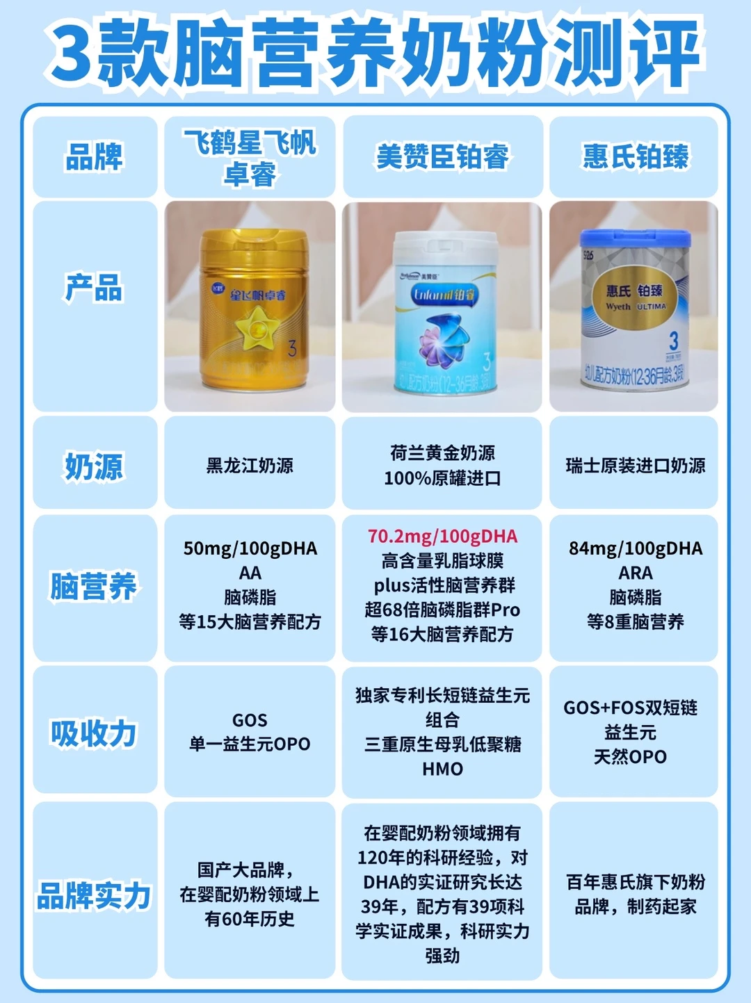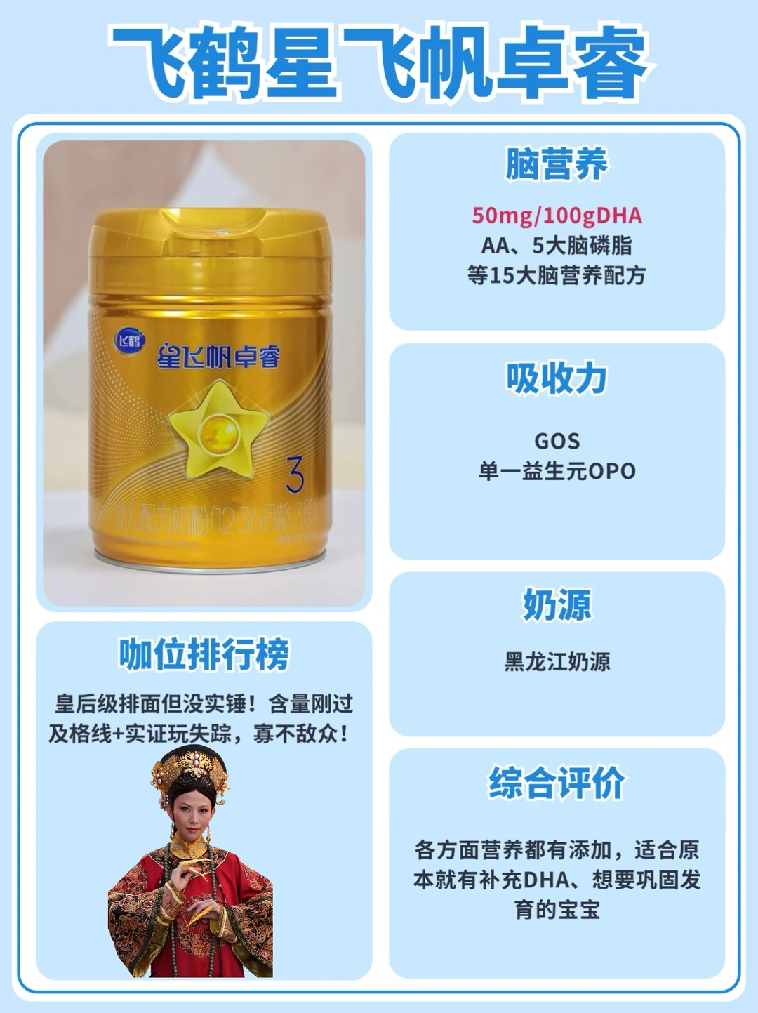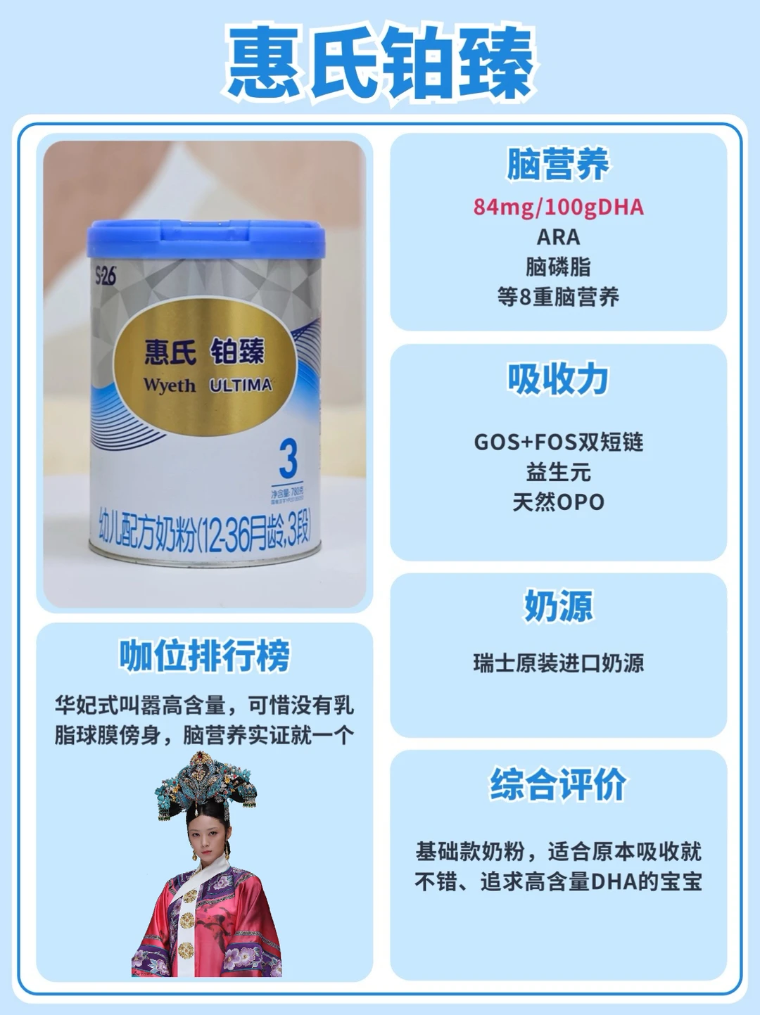 姐妹们!皇上(宝宝)的黄金1000天江山社稷(大脑发育)可耽误不得!\n可满后宫的脑营养奶粉个个自称\"皇贵妃\",本宫选得头风都要犯了!\n今儿咱就用《甄嬛传》打开测评,看看美赞臣铂睿、飞鹤卓睿、惠氏铂臻,谁是真·熹贵妃,谁是绣花枕头齐妃!\n[💡省流版|脑营养妃嫔位份册封]\n✨ 钮祜禄·甄嬛——美赞臣铂睿\n脑营养界黑化归来的熹贵妃!脑营养顶配+科学实证护体,活该她当太后!\n✨ 乌拉那拉·宜修——飞鹤卓睿\n皇后级排面但没实锤!含量刚过及格线+实证玩失踪,终究是寡不敌众啊!\n✨ 年世兰——惠氏铂臻\n华妃式叫嚣高含量,可惜没有乳脂球膜傍身,脑营养实证就一个,错付了!\n-\n[🔍宫斗大戏|脑营养妃嫔述职现场]\n————— 钮祜禄·美赞臣铂睿 —————\n人设:从菀常在杀穿全场的终极赢家\n一出场就拿着\"70.2mg/100g国际优量DHA\"的纯元配置,更带着乳脂球膜和68倍脑磷脂群Pro两大杀器,16种脑营养组团上分,妥妥的\"三阿哥又长高\"的学霸人设。\n科学实证buff叠满:\n全配方拿捏欧盟国际认证,脑营养的科研论文多得像敬妃宫中的砖块,活脱脱本宫倒要看看谁敢动我的孩子!\n————— 乌拉那拉·飞鹤卓睿 —————\n人设:靠宫中名气吃饭的宜修皇后\n顶着\"国产奶粉C位\"的名头,DHA50mg/100g堪堪过线,5大脑磷脂听着富贵,可乳脂球膜含量像极了剪秋的毒指甲——藏着掖着!15种脑营养看着体面,却连篇像样的实证论文都拿不出...\n科研属实有些\"臣妾做不到啊\":\n脑营养?那都是本宫用祖制(中国母乳研究)撑着的!科学实证?剪秋(客服)说在路上了!\n————— 年世兰·惠氏铂臻 —————\n人设:家世显赫但实力不够的华妃\nDHA84mg/100g嚣张得像欢宜香!脑磷脂群8重加持,乍一看能把安陵容秒成灰。可惜没乳脂球膜就像华妃没儿子,脑营养配置直接被熹贵妃甩出景仁宫!\n实证像极了\"就赏本宫一篇吧\":\n脑磷脂研究?有是有,可比起熹贵妃的国际论文,活脱脱翊坤宫夜半唱的\"楼东赋\"!\n看完今天这期测评,你pick哪位妃子呢?\n