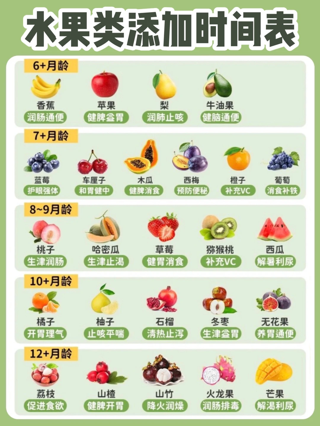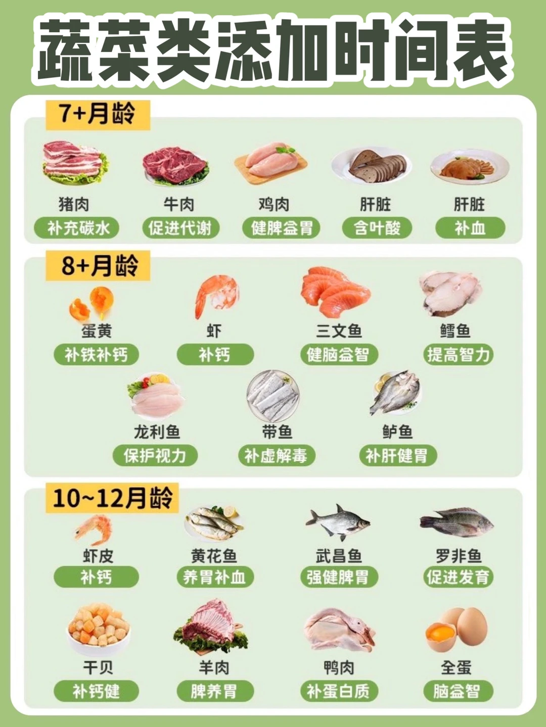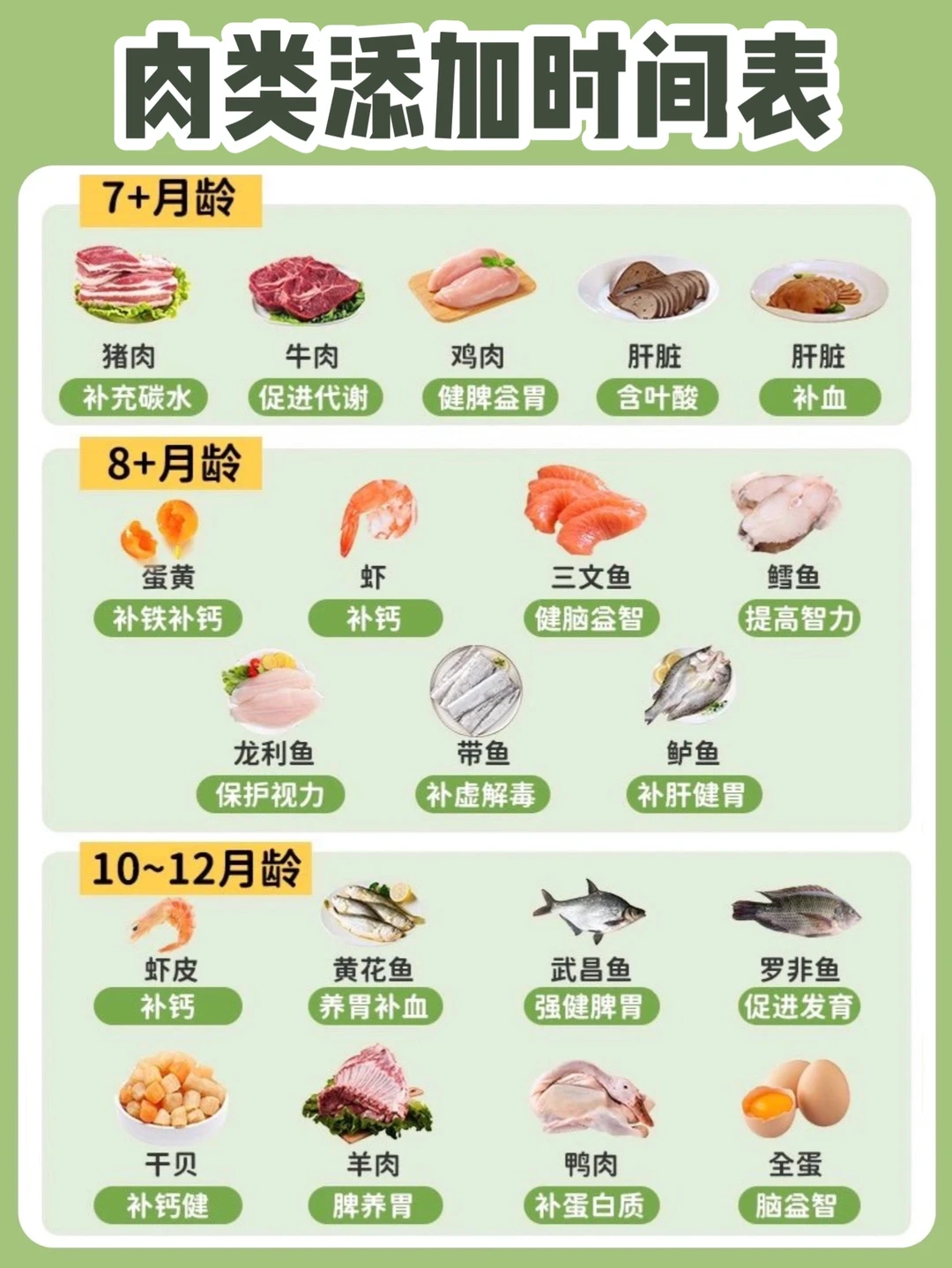 宝宝在6个月就要开始添加辅食了,这时候很多新手爸妈的问题就来了,具体辅食怎么添加呢?水果类,肉类,蔬菜类的添加顺序是什么呢? 每次只给宝宝添加一种新食物,由少到多,由稀到稠,由细到粗,循序渐进 每一种新的食物要适应2-3天,观察有无不良反应,适应后再添加新的食物 辅食泥的添加顺序是,菜泥➡️果泥➡️肉泥 今天也给大家整理了6-12月龄,水果类,肉类,蔬菜类的添加时间表,如上图 ⚠️以上进食时间仅供参考,可以根据自家宝宝进食情况适当调整~