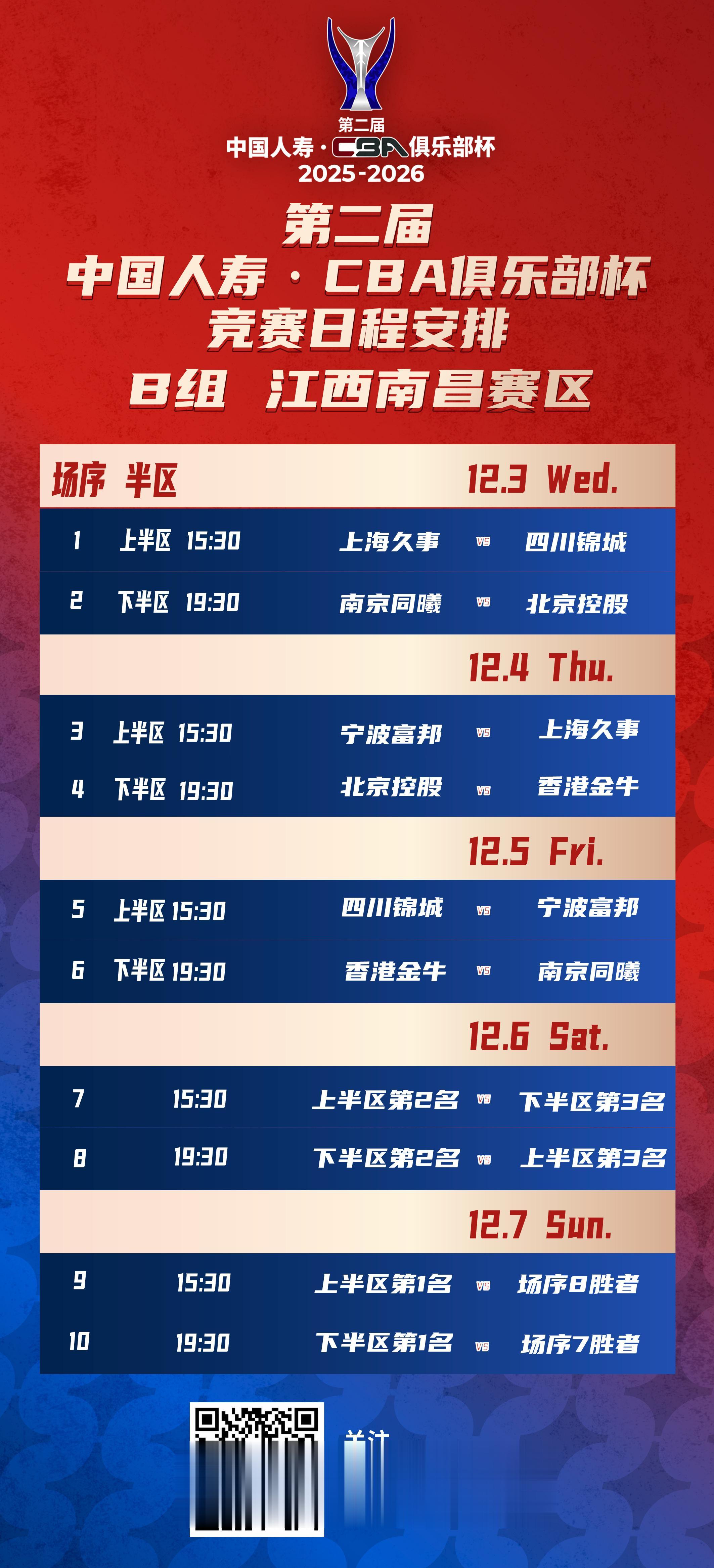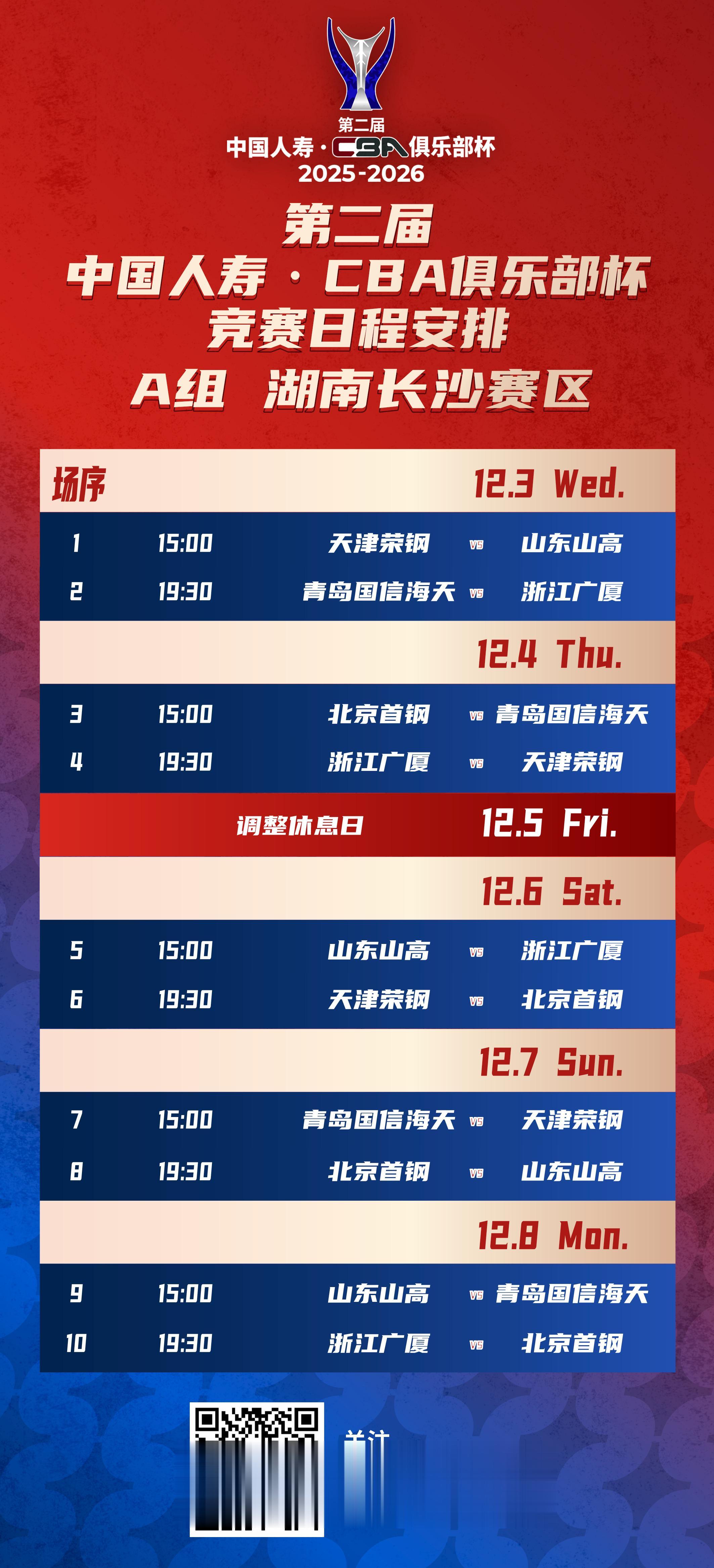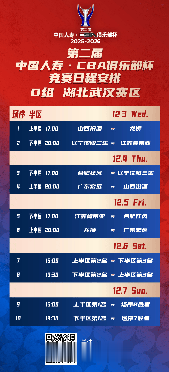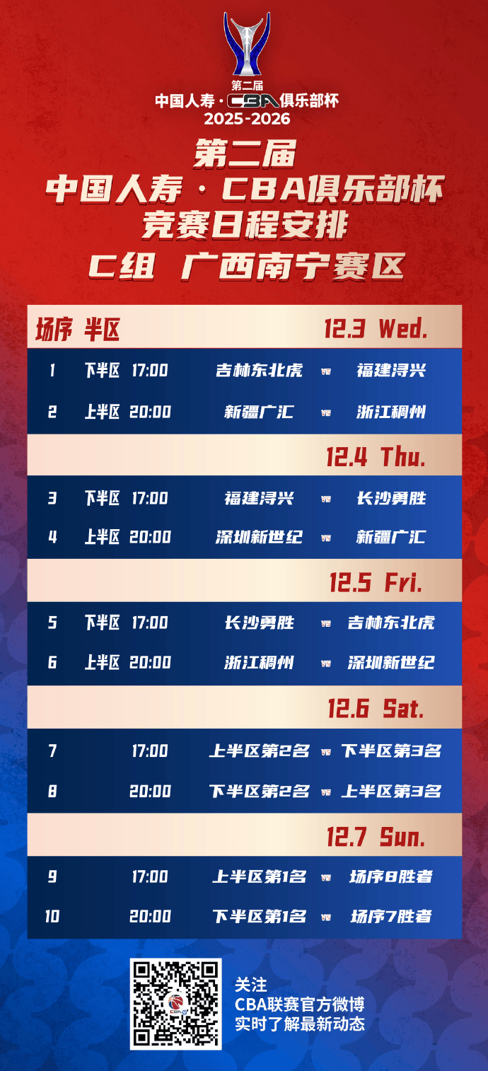 第二届中国人寿CBA俱乐部杯小组赛将于2025年12月3日-8日在湖南长沙、江西南昌、广西南宁和湖北武汉四个赛区进行,小组赛赛程现已火热出炉!决赛阶段的比赛则将于2026年2月6日-12日在内蒙古自治区呼和浩特市进行。