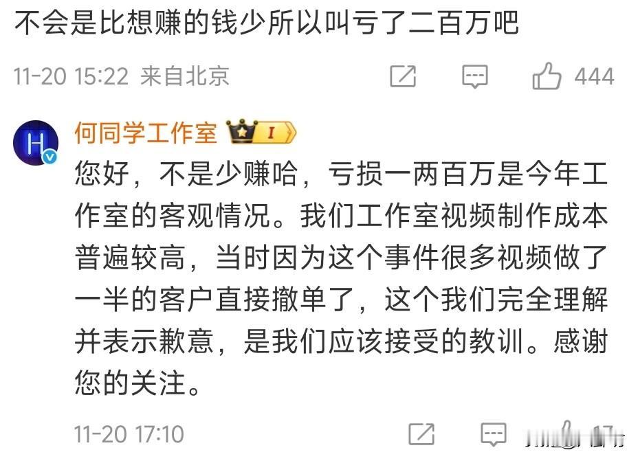网红何同学自曝,说自己今年亏了200万元,而这一切的起因,是他当时发了一条《要有拒绝给司机好评的勇气》。 从这之后,何同学的风评就急转直下,直到现在开始入不敷出。 至于为什么会亏这么多,他解释是因为视频制作成本高,加上客户撤单等等。 说实话,作为一个公众人物还是得谨言慎行,可能一句话就会毁了自己事业。
