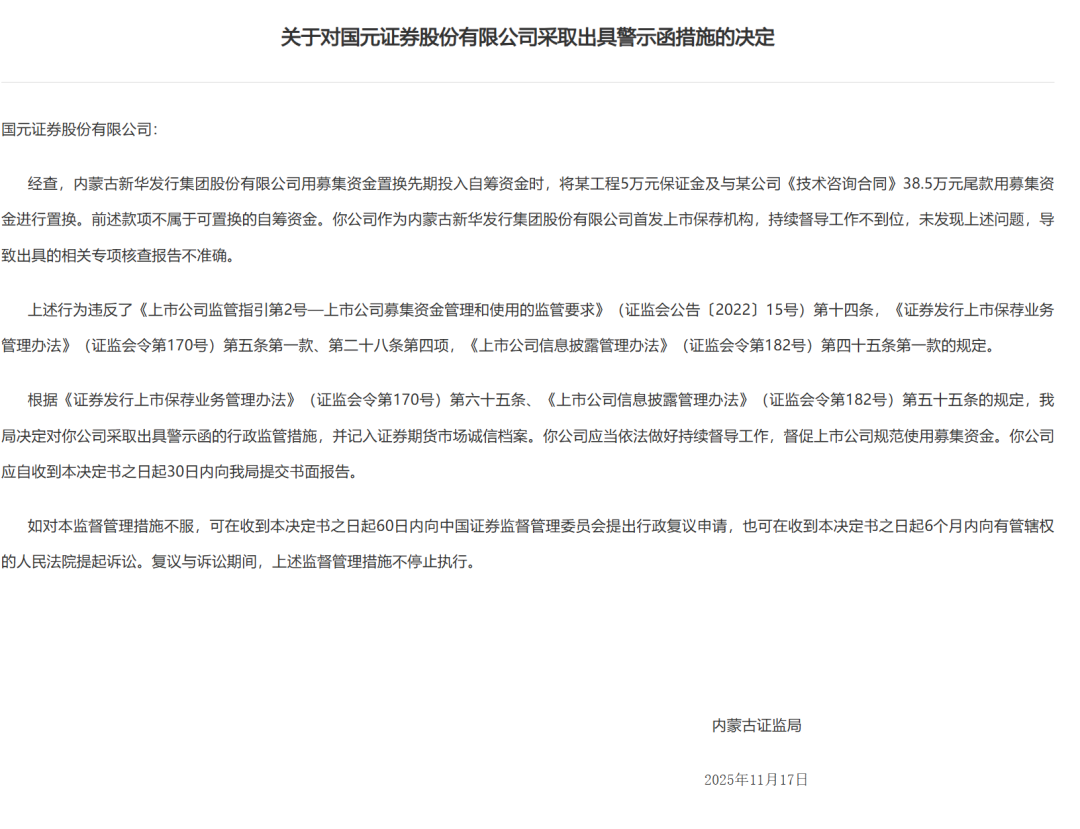 2025年11月17日,内蒙古证监局对国元证券出具行政处罚决定书。经查,内蒙古新华发行集团股份有限公司用募集资金置换先期投入自筹资金时,将某工程5万元保证金及与某公司《技术咨询合同》38.5万元尾款用募集资金进行置换。前述款项不属于可置换的自筹资金。你公司作为内蒙古新华发行集团股份有限公司首发上市保荐机构,持续督导工作不到位,未发现上述问题,导致出具的相关专项核查报告不准确。