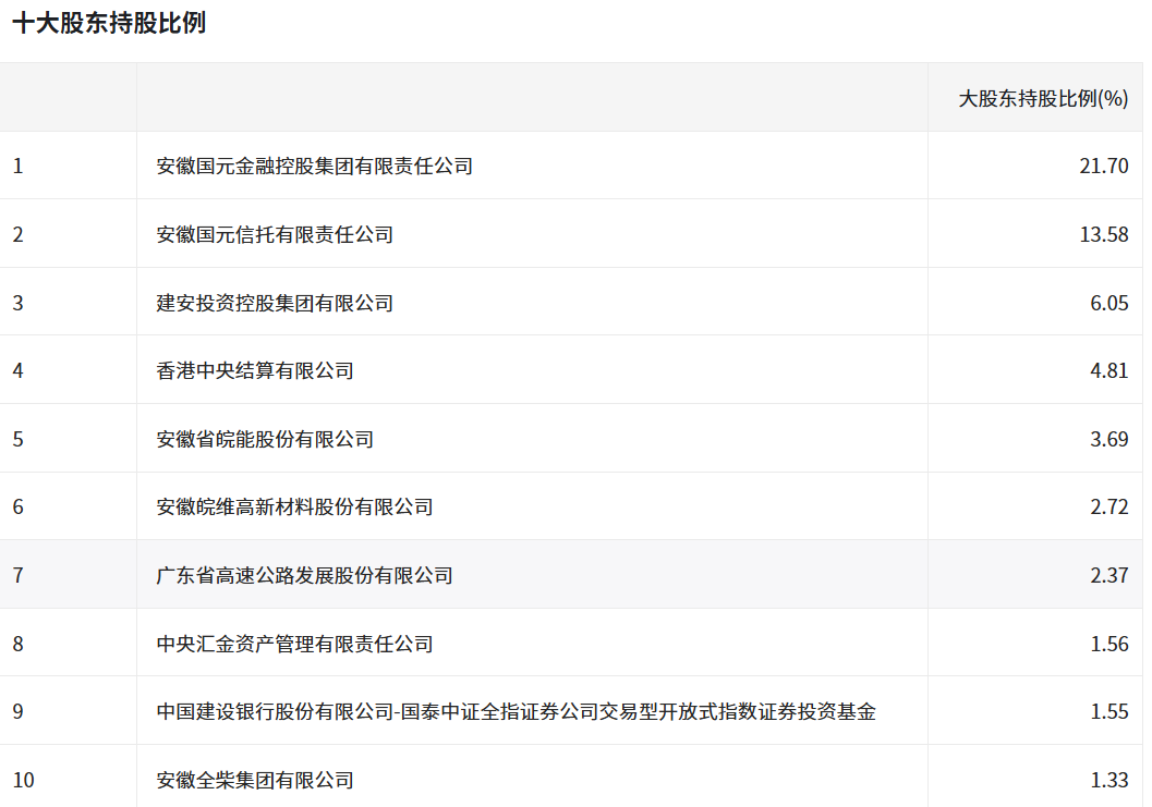 根据同花顺显示,国元证券的十大股东持股比例情况如下: