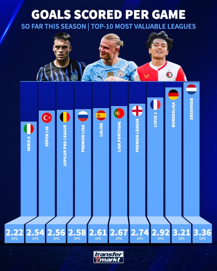 直播吧11月20日讯德国转会市场统计了欧洲总身价前10联赛的场均进球数量,并列出榜单,荷甲3.36球居首,德甲、法甲二三位、意甲2.22球垫底。
