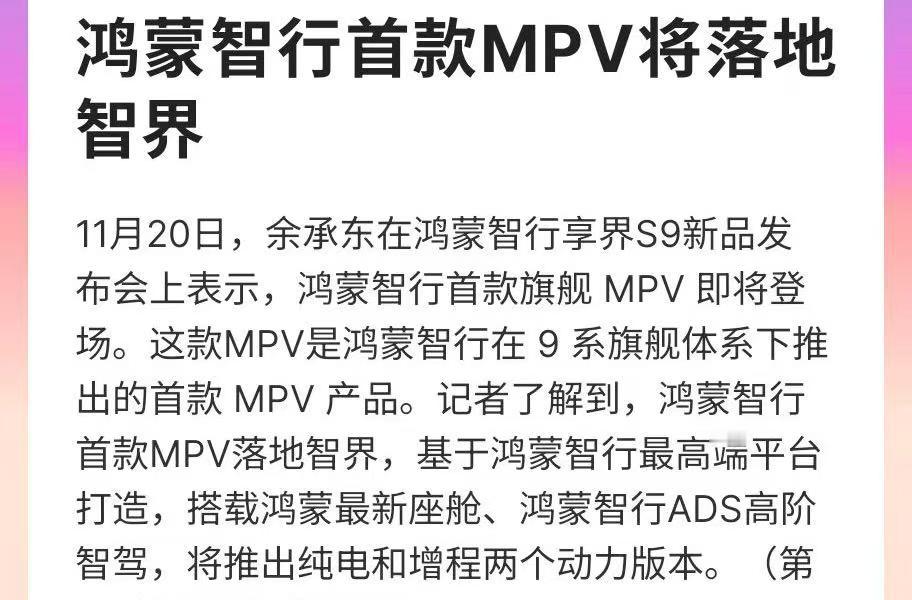 鸿蒙智行的车型版图一直缺一辆MPV,这事儿看来是由智界办了,市场需求肯定是拉满的,更值得关注的是智界一直都是鸿蒙首发产品的阵地,这次也更加坐实了智界“纯血鸿蒙”的位置。据悉,新车基于最高端平台打造,匹配鸿蒙最新座舱、ADS高阶智驾辅助、纯电增程双动力,都是国内高端新能源MPV中差异化的存在。问题来了,这车出来之后,谁最慌?