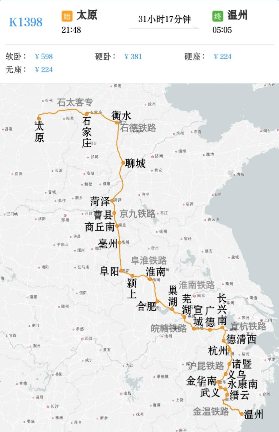 温州到太原绿皮火车一对 温州到太原K1396/K1397次 浙江省沿途经过车站站站停 太原到温州K1398/K1395次 安徽省沿途经过车站站站停