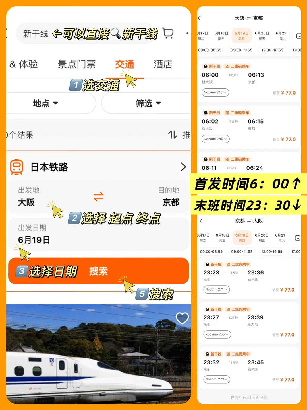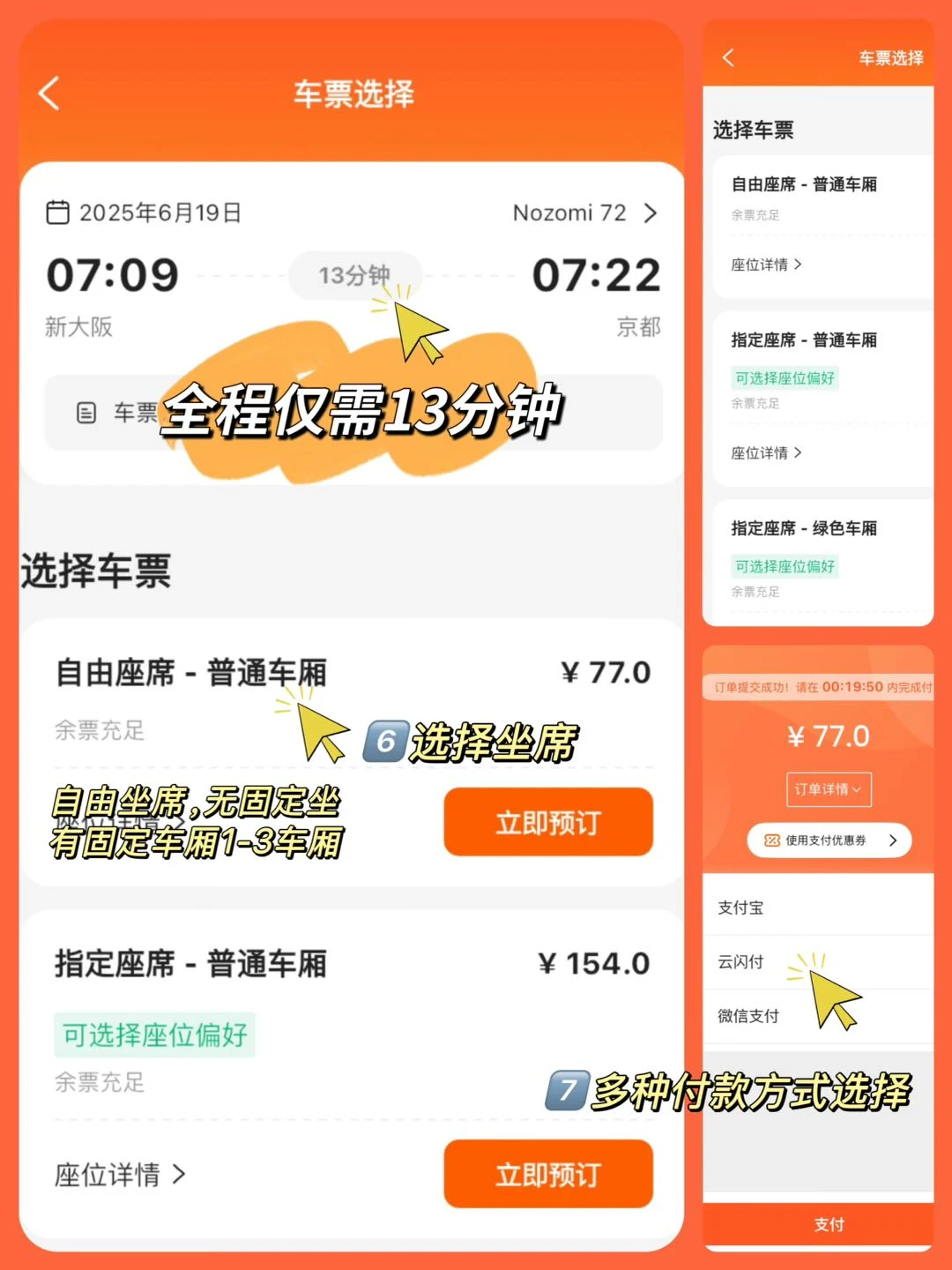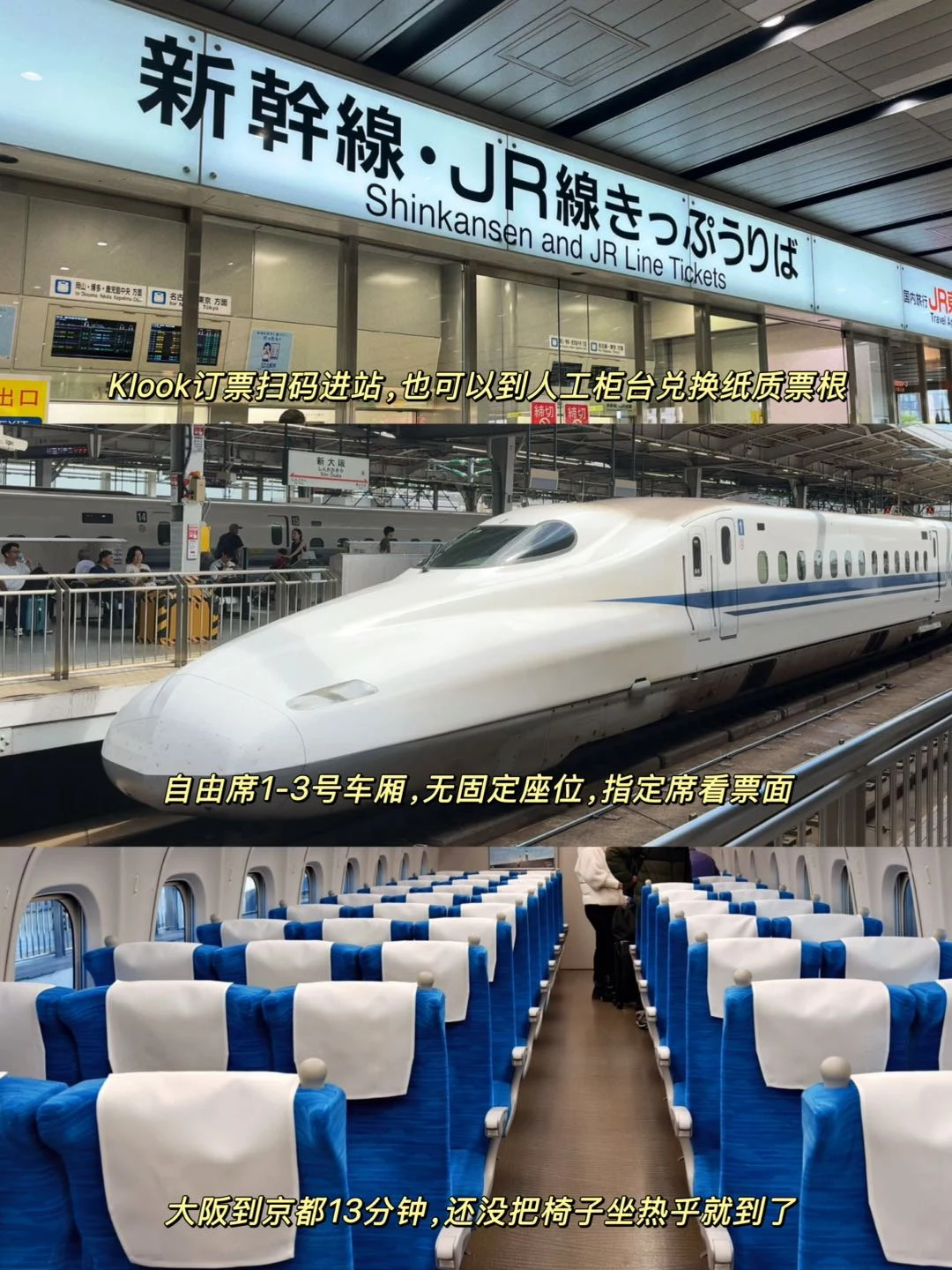 去日本玩的有福了!不会日语也能轻松买新干线!大阪往返京都坐新干线只要13分钟,超省时~🌸分享Klook订票的保姆级攻略,中文界面+扫码进站,完全不用怕语言障碍👇 ✅ 为啥选Klook? [一R]全中文操作,订票像买国内高铁一样简单 [二R]提前选,指定席可挑靠窗位或大件行李的座位 [三R]支持支付宝/微信支付,不用换日元 [四R]购票后直接拿电子二维码进站,不用排队换票 [五R]还能攒积分抵现金,四舍五入又省钱啦! ✅ 订票步骤超简单: 1. 打开Klook APP,点交通→火车→日本铁路 2. 选出发地(大阪)、目的地(京都)和日期 3. 挑班次和座位类型:自由席/指定席/绿色车厢 4. 填信息付款,收到带二维码的电子凭证保存好 5.抵达出发站,找到新干线检票口,有QR标识的闸机扫手机二维码进站!出站也是找到相应闸机扫码出站。 ✅ 乘车注意点: [一R]核对乘车信息:进站后看电子屏,按「列车名+发车时间」找站台 [二R]不同车厢的扶梯是分开的,看好车票上的车厢号再上楼。 [三R]静音礼仪:日本公共交通注重安静,乘车时建议将手机调至静音,通话、追剧使用耳机,避免外放声音干扰其他乘客。 [四R]高峰期拥挤:工作日早晚高峰,及节假日期间,自由席可能出现满员情况,赶时间建议选择指定席,确保有座位。 [五R]有28寸以上行李需买“特大行李座位”否则可能罚款1000日元。 ❇️去日本玩用这个方法订票,不怕看不懂日文啦!🆙KLOOK不仅可以预定交通车票,还有日本的酒店、乐园门票、美食、一日游体验等,在Klook也都能找到。去日本旅游,必备APP!用Klook就对啦‼️
