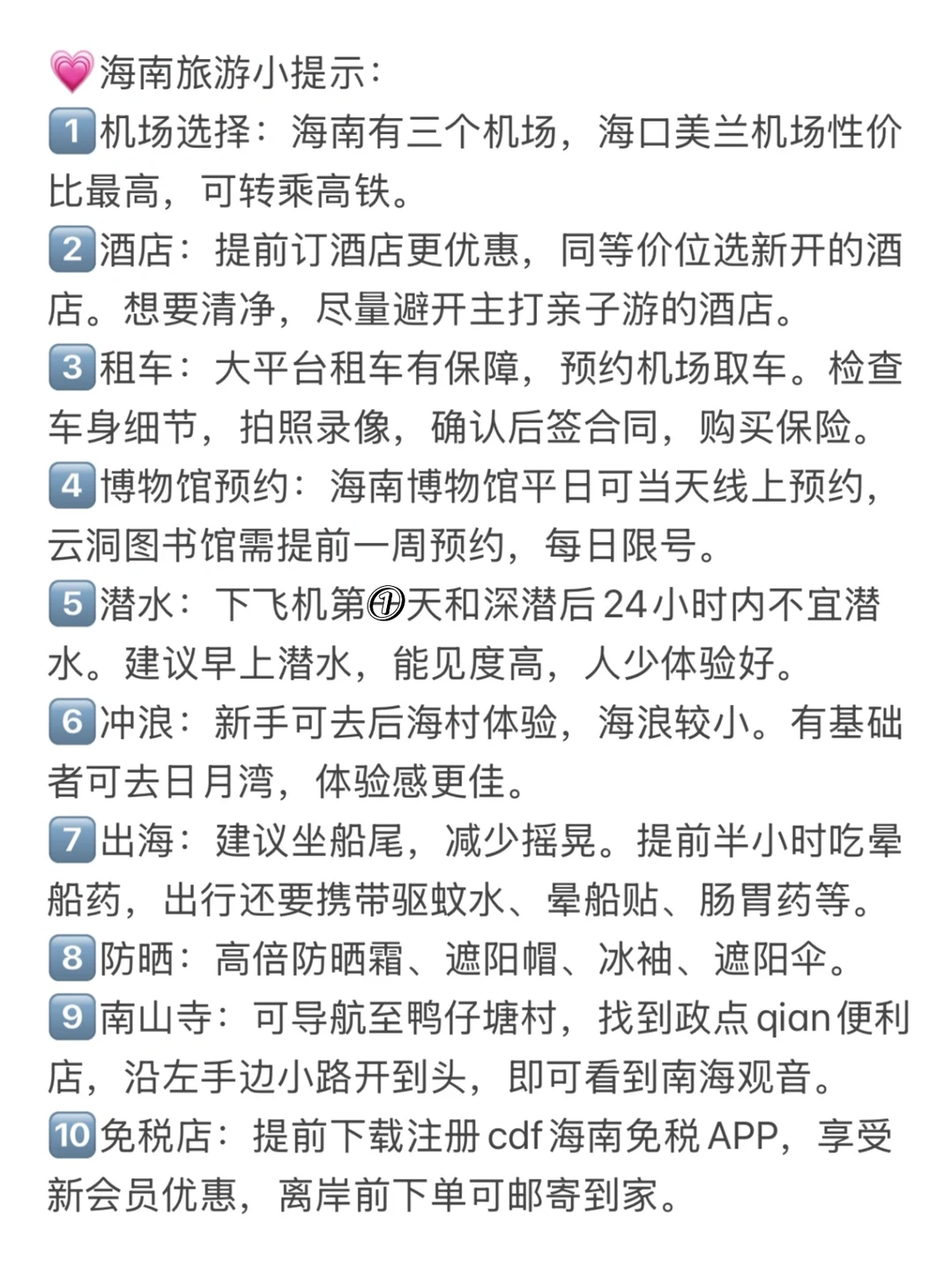 无需烧脑规划,直接按顺序抄作业!小长假/年假通用👇 ✈️【交通指南】 ▪落地首选:海口美兰机场(机票性价比高) ▪出行建议:租车自驾>高铁+打车(环岛高速路况佳) 🚗【东海岸环岛路线】 自驾:海口→文昌→琼海→万宁→陵水→三亚→崖州 动车:美兰→文昌→博鳌→万宁→神州→陵水→亚龙湾→三亚→南山北站 🗺【城市攻略】 1️⃣ 海口(1-2天) 🏨住宿:骑楼老街民宿 🔥必打卡: ▪骑楼老街/云洞图书馆/冯小刚电影公社 ▪天空之山/世纪大桥夜景/椰树集团/万绿园 ▪海大南门夜市/西天庙小吃街/老爸茶 2️⃣ 文昌(1天) 🏨住宿:淇水湾民宿 🔥必打卡: ▪登铜鼓岭俯瞰月亮湾 ▪淇水湾/东郊椰林/海上图书馆/文南老街 ▪特别体验:远观卫星发射基地 3️⃣ 琼海博鳌(1天) 🏨住宿:博鳌镇酒店 🔥必打卡: ▪孟菜园/牛奶海/任意门/南海博物馆 ▪红石滩奇观+玉带滩日落 4️⃣ 万宁(2-3天) 🏨住宿:日月湾酒店 🔥必打卡: ▪冲浪:日月湾/石梅湾 ▪网红:科罗娜餐吧、Cashcow西餐、Goofydog餐吧 ▪兴隆咖啡/神州灯塔/椰林大道/融创教堂/椰坊拍照 5️⃣ 陵水(2-3天) 🏨住宿:清水湾酒店 🔥亲子必玩: ▪分界洲岛喂魔鬼鱼/月光古堡/海上木屋 ▪南湾猴岛/呆呆岛/清水湾/疍家渔排海上餐厅 🌌夜游富力海洋世界,看烟花秀(仅节假日有) 6️⃣三亚(4-5天) 🏨住宿指南: ▪奢华度假:海棠湾/亚龙湾一线海景酒店 ▪性价比:后海村/博后村民宿/三亚湾 🔥必打卡: ✅海棠湾:cdf免税店/亚特兰蒂斯水族馆/亚特兰蒂斯水乐园/蜈支洲岛-潜水/海棠湾跳伞🪂 ✅亚龙湾:亚龙湾森林公园/太阳湾公路 ✅三亚湾:椰梦长廊/西岛文艺游 ✅崖州:南山寺-南海观音/天涯海角 ⚠️【行前必看】 1️⃣ 租车建议选新能源车(环岛充电桩完善) 2️⃣ 免税购物建议放行程最后(APP下单,机场提货) 3️⃣防晒三件套:高倍防晒霜+遮阳帽+冰袖