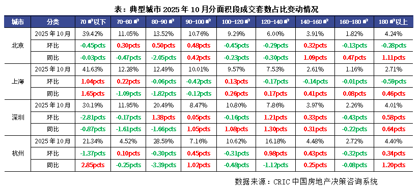 从二手房成交面积段来看,京沪深总体呈现出70平方米以内小面积段仍是成交主力,2025年10月成交套数占比均在3成以上,其中上海成交集中度仍在上升,70平方米以内小面积段极致刚需成交占比同环比增幅均超1pcts。而北京、深圳70平方米以内小面积户型占比同环比齐跌,而80-100平方米环比持增,这部分房源多为二房或小三房设计,当前二手房“以价换量”背景下,性价比优势凸显,成交占比持续上行。此外,京深杭等140-160平方米中等偏大面积段房源成交占比也有同环比齐增态势,这类产品多为三房/四房设计,户型舒适度较高,可以满足“一步到位”的自住需求。
