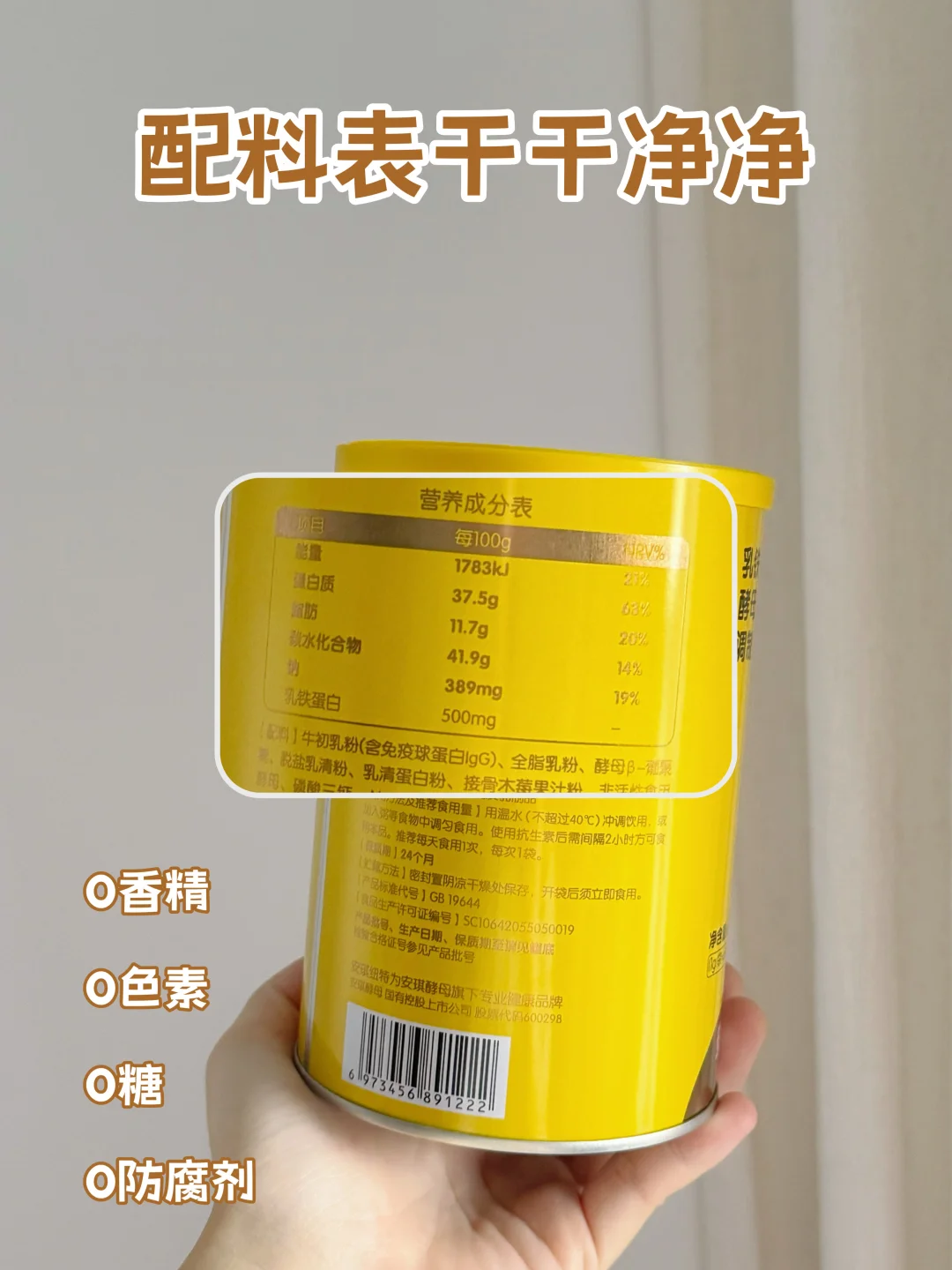 🔹性价比很高,含量一点也不马虎,每100g就含有500mg的乳铁蛋白、12000mg的酵母β-葡聚糖、10000mg免疫球蛋白,高含量才更给力,轻松拿捏脆皮娃!而且配料表干净,0白砂糖,0色素,0香精,给宝宝喝也放心些~