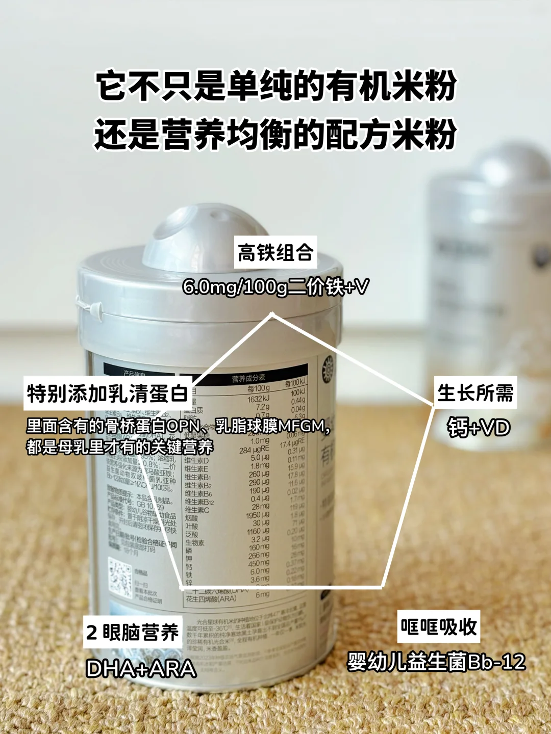 🔹不光这些,它的营养也特能打:二价铁+乳清蛋白, 二者加持!还添加了卫健委推荐的益生菌Bb-12,比普通米粉好吸收很多。而且连DHA和RAR都考虑到了,脑眼营养一起兼顾到位!