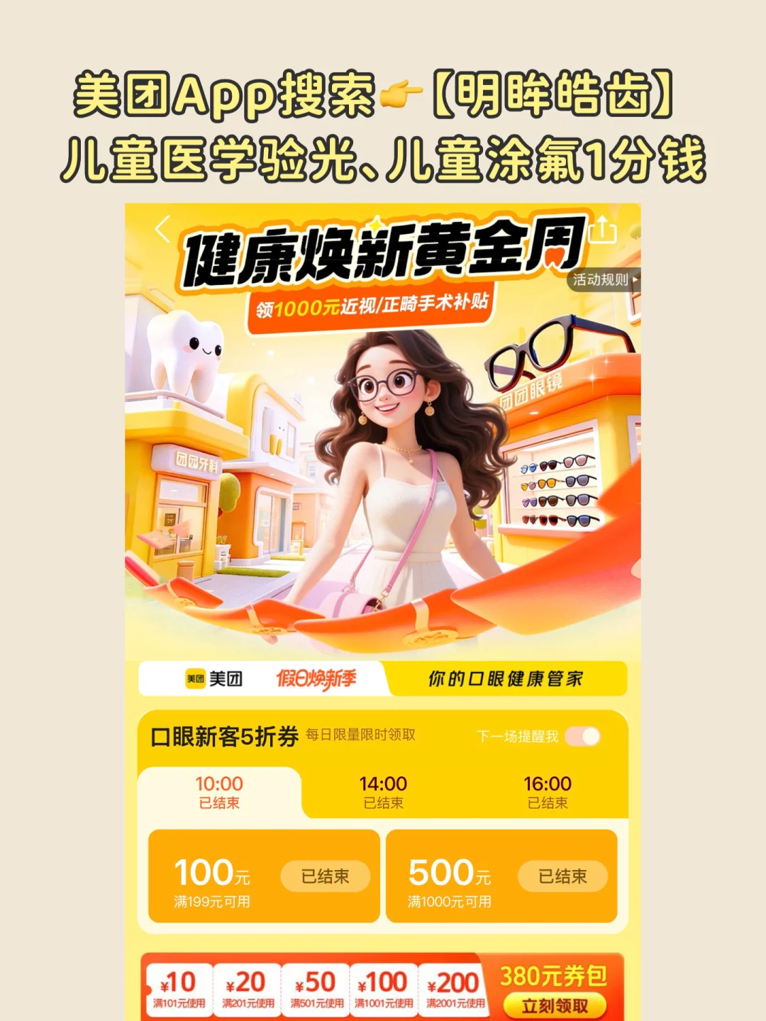 就好比如最近的美团App就有,搜索【宝爸宝妈1分抢】 进入,只需1分钱💰就能体验儿童医学验光、儿童涂氟哦!我看了下,活动时间是8月8日-8月24日[黄金薯R],不就是这个月吗?需要的家长们,赶紧冲!!